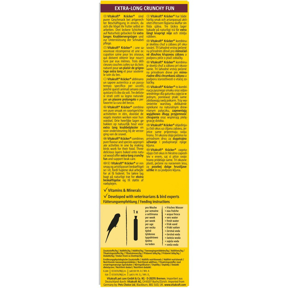Крекер з фруктами для хвилястих папуг – смачне і корисне доповнення до основного раціону вихованця. Ласощі є додатковим джерелом вітамінів і мінералів. Підтримує оптимальний стан хвилястих папуг і задовольняє їх потребу у сточуванні дзьоба. Виготовлений за унікальною технологією триступеневого запікання і не містить цукру. В упаковці 2 крекери.Склад: злаки, насіння, фрукти (інжир сушений 1.5%, абрикос сушений 0.92%), мінерали, продукти рослинного походження, мед, яйце і яєчні продукти, овочі, морські водорості.Добавки на 1 кг:вітамін А – 6300 МО, вітамін D3 – 630 МО.Рекомендації з годування:крекер завжди має бути у клітці птаха.