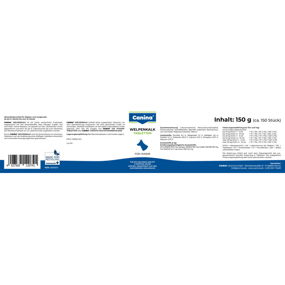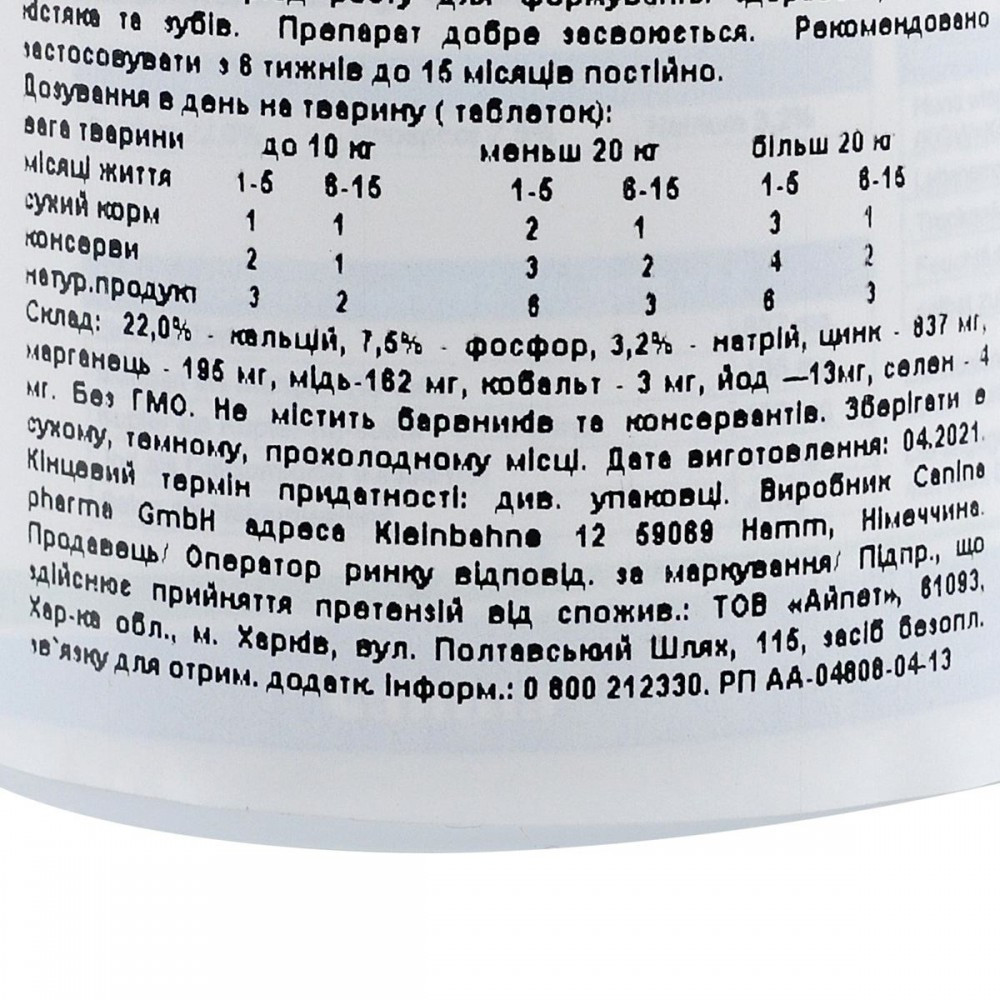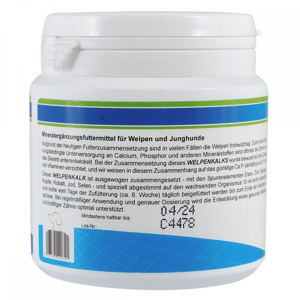 Мінеральна добавка для цуценят, створена спеціально для зростаючого організму, щоб забезпечити оптимальний розвиток скелета і зубів. Продукт розроблений на основі наукових досліджень і відповідно до рецептури доктора Клауса. Співвідношення кальцію і фосфору 3:1 гарантує надходження кальцію в організм в повній мірі.До складу Welpenkalk входять мінеральні речовини, такі як цинк, мідь, йод, марганець, кобальт, селен. Цинк і селен – необхідні компоненти для імунної системи, сприяють засвоєнню вітамінів групи В, захищають хімічні структури від окислення, єко факторами багатьох ферментів і покращують обмінні процеси. Марганець – бере активну участь в білковому і вуглеводному обміні, стимулює діяльність ферментів, впливає на засвоєння кальцію і фосфору. Мідь і кобальт – позитивно впливають на процеси кровотворення і тканинного дихання.Йод бере участь в синтезі гормонів щитовидної залози (тироксину і трийодтироніну). Ці гормони регулюють процеси росту цуценят і активізують обмін речовин, стимулюють діяльність основних систем організму. Коли в організмі не вистачає йоду, різко проявляється гіпофункція щитовидної залози, молодняк погано росте і розвивається.Застосування:З 6-го тижня життя цуценяти, щодня до кінця основного періоду росту(приблизно до 15-18 місяців).Якщо Ви годуєте собаку переважно натуральною їжею або консервами, в якості доповнення необхідно давати вітаміни V 25, Vitamin tabs або Canivita.Склад:Таблетки: Карбонат кальцію, монокальційфосфат, цитрат кальцію, дріжджі.Порошок: Карбонат кальцію, монокальційфосфат, хлорид натрію, цитрат кальцію, дріжджі.Аналітичний склад:Таблетки: 22% кальцію, 7,5% фосфору, 3,2% натрію.Порошок: 20,2% кальцію, 7,0% фосфору, 3,0% натрію.Додаткові речовини на 1 кг:Таблетки: Оксид цинку – 837 мг, оксид марганцю -195 мг, пентагідрат сульфату двовалентної міді -162 мг, кальцій йодат -13 мг, селеніт натрію-4 мг, кобальт-II-карбонат моногідрат- 3 мг.Порошок: Оксид цинку – 877 мг, оксид марганцю – 204 мг, пентагідрат сульфату двовалентної міді – 170 мг, кальцій йодат – 14 мг, селеніт натрію – 4 мг, кобальту-II-карбонат моногідрат – 3 мг.