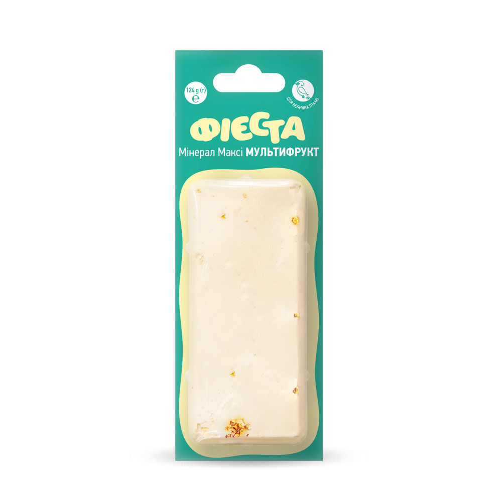 Мінерал «Мультифрукт» виготовлений на основі пресованого карбонату і сульфату кальцію з додаванням сухих ягід і фруктів. Розроблено як щоденна добавка до раціону великих папуг.Мінерали мають велике значення в процесі травлення птахів: їжа перетирається в м’язовому шлунку за допомогою абразивних матеріалів (гастролітів). Таким чином забезпечується якісна підготовка корму, полегшується травлення і засвоєння компонентів корму. Але в міру травлення виводяться гастроліти і потрібно їх щоденне поповнення, наприклад, мінералом.Крім того, важливий аспект вживання мінералу – постійне зростання тканин дзьоба, що вимагає постійного сточування і чищення. Важливо достатню кількість мінералів і для формування кісток, пера, яєць. Додавання сушених ягід і фруктів стимулює птаха до поїдання мінералу і служить джерелом пектину та інших вуглеводів, а сам процес подрібнення мінералу і вилучення ягід стає цікавим корисним заняттям для птаха.Склад: кальцію сульфат, кальцію карбонат, сушені фрукти і ягоди.Рекомендації.Додавати до щоденного раціону. В поїлці завжди повинна бути свіжа вода.Умовизберігання.У сухому приміщенні при температурі від 0 до 30 °С та відносній вологості не більше 75%.