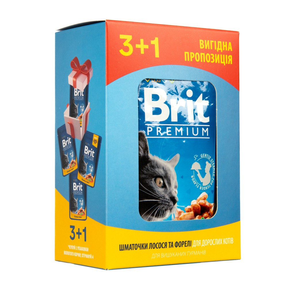 Набір паучів 3+1 Brit Premium Cat Beef Salmon and Trout для котів шматочки в соусі з лососем і фореллю 4х100 г