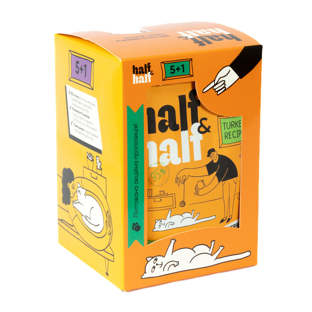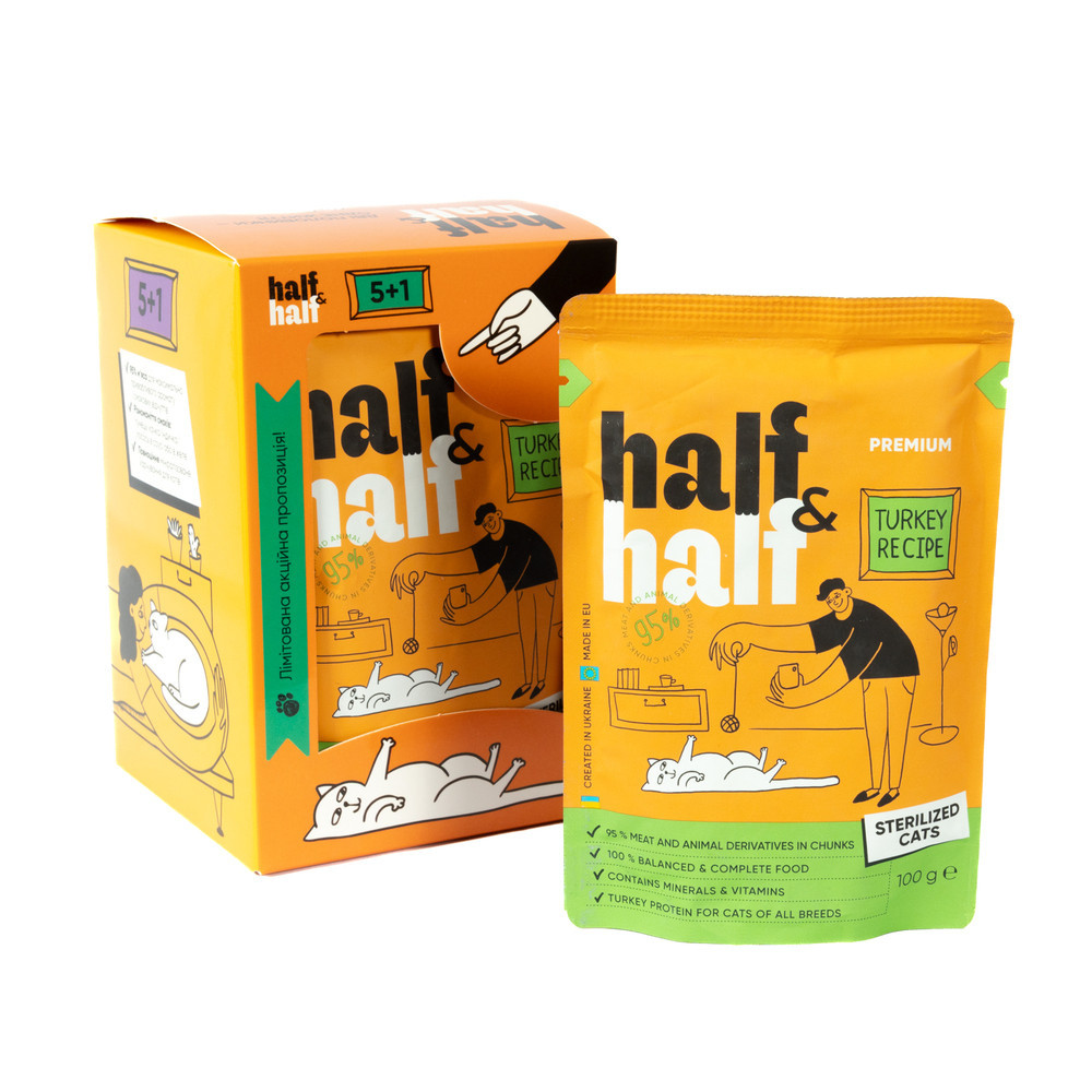 Ще більше корму для хвостатих половинок!Цей набір містить 6 паучів повнораціонного вологого корму для стерилізованих котів “ІНДИЧКА В ЖЕЛЕ”.Курка з індичкою – чудове поєднання дієтичних м’ясних компонентів для стерилізованих котиків, які схильні до набору зайвої ваги.Високий відсоток вологи допомагає підтримувати водний баланс котиків на сухих раціонах, які можуть не випивати свою добову норму питної води. Це слугує чудовою профілактикою сечокам’яної хвороби.Полегшений за калорійністю вологий раціон Half&Half стане чудовим дієтичним доповненням до сухого корму для стерилізованих малоактивних котів, у тому числі літніх улюбленців.Зменшена кількість сирого жиру сприяє полегшенню травлення, що оптимально для підтримки здоров’я печінки та підшлункової залози котів.СКЛАД: м’ясо та продукти тваринного походження у шматочках (95%, з яких курка 75%, індичка 10%), мінерали, продукти рослинного походження.АНАЛІТИЧНИЙ СКЛАД:сирий білок – 8,5 %, сирий жир – 3,0 %, сира клітковина – 0,4 %, вологість – 83,0 %, сира зола – 2,1 %.ДОБАВКИ(на кг). Харчові добавки: таурин – 1000 мг, вітамін E – 100 мг, цинк – 10 мг, марганець – 2 мг, йод – 0,7 мг, мідь – 2 мг, залізо – 2 мг, біотин – 100 мкг, вітамін D3 – 300 МО. Технологічні добавки: камедь касії – 2088 мг.ЕНЕРГЕТИЧНА ЦІННІСТЬ:71,0 ккал/ 100 г.
