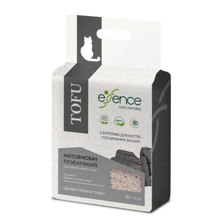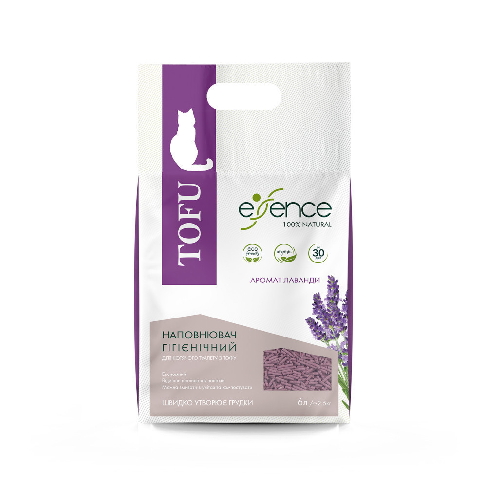Вдалий вибір наповнювача для котячого туалету позбавить вас від клопоту із неприємним запахом, а вашого котика – від дискомфорту, спричиненого жорсткими гранулами, неприродним шурхотом чи відразливим ароматом.Щоб улюбленець завжди робив свою справу «чисто», використовуйте соєвий наповнювачі Essence Tofu!Його особливості:100% натуральні рослинні інгредієнти – вироблено з пресованих соєвих волокон. Цей матеріал безпечний для здоров’я домашніх вихованців і людей.Супервисока поглинаюча здатність – 300%. Завдяки цьому швидко формуються міцні грудочки, які легко прибирати з котячого лотку.Використаний наповнювач можна утилізувати з органічними відходами відповідно до нормативних вимог/правил утилізації відходів.М’яка структура є лагідною для лапок вашого котика та не подразнює їх.Склад:спресована маса соєвих волокон, харчовий крохмаль, гуарова камедь, есенція лаванди. Не містить шкідливих для здоров’я тварин та людей речовин. Без ГМО.Розмір гранули:2 ммМаса нетто:2.5 кгОб’єм:6 лСпосіб використання:засипте наповнювач шаром 5-6 см у чистий та сухий котячий лоток. Після використання туалету котом, видаліть лопаткою тверді відходи (екскременти) та грудочки в сміттєвий пакет або іншу ємкість. Додайте наповнювач до попереднього рівня. Вимийте руки після заповнення лотка. Рекомендуємо періодично проводити дезінфекцію лотка або котячого туалету, в якому використовується наповнювач.Поради щодо використання:якщо у вас не один кіт, рекомендується не збільшувати кількість наповнювача, а частіше видаляти використаний. Якщо вашому коту складно звикнути до нового наповнювача, то спробуйте в перший місяць змішувати його з попереднім наповнювачем у співвідношенні 50/50 %.