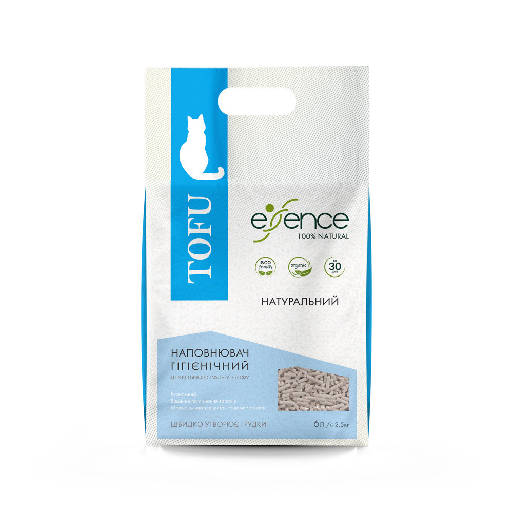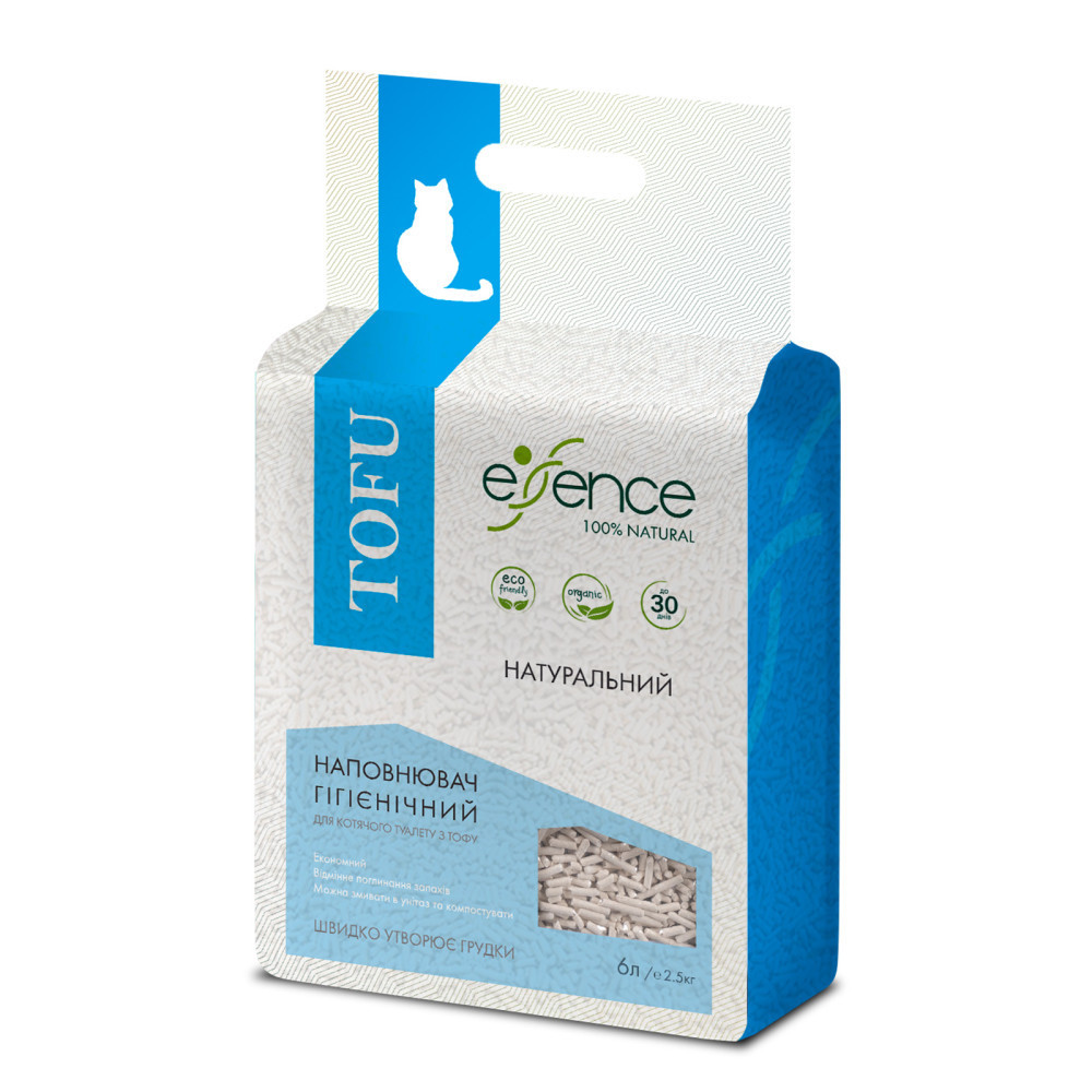 Вдалий вибір наповнювача для котячого туалету позбавить вас від клопоту із неприємним запахом, а вашого котика – від дискомфорту, спричиненого жорсткими гранулами, неприродним шурхотом чи відразливим ароматом.Щоб улюбленець завжди робив свою справу «чисто», використовуйте соєвий наповнювачі Essence Tofu!Його особливості:100% натуральні рослинні інгредієнти – вироблено з пресованих соєвих волокон. Цей матеріал безпечний для здоров’я домашніх вихованців і людей.Супервисока поглинаюча здатність – 300%. Завдяки цьому швидко формуються міцні грудочки, які легко прибирати з котячого лотку.Використаний наповнювач можна утилізувати з органічними відходами відповідно до нормативних вимог/правил утилізації відходів.М’яка структура є лагідною для лапок вашого котика та не подразнює їх.Склад:спресована маса соєвих волокон, харчовий крохмаль, гуарова камедь. Не містить шкідливих для здоров’я тварин та людей речовин. Без ГМО.Розмір гранули:3 ммМаса нетто:2.5 кгОб’єм:6 лСпосіб використання:засипте наповнювач шаром 5-6 см у чистий та сухий котячий лоток. Після використання туалету котом, видаліть лопаткою тверді відходи (екскременти) та грудочки в сміттєвий пакет або іншу ємкість. Додайте наповнювач до попереднього рівня. Вимийте руки після заповнення лотка. Рекомендуємо періодично проводити дезінфекцію лотка або котячого туалету, в якому використовується наповнювач.Поради щодо використання:якщо у вас не один кіт, рекомендується не збільшувати кількість наповнювача, а частіше видаляти використаний. Якщо вашому коту складно звикнути до нового наповнювача, то спробуйте в перший місяць змішувати його з попереднім наповнювачем у співвідношенні 50/50 %.
