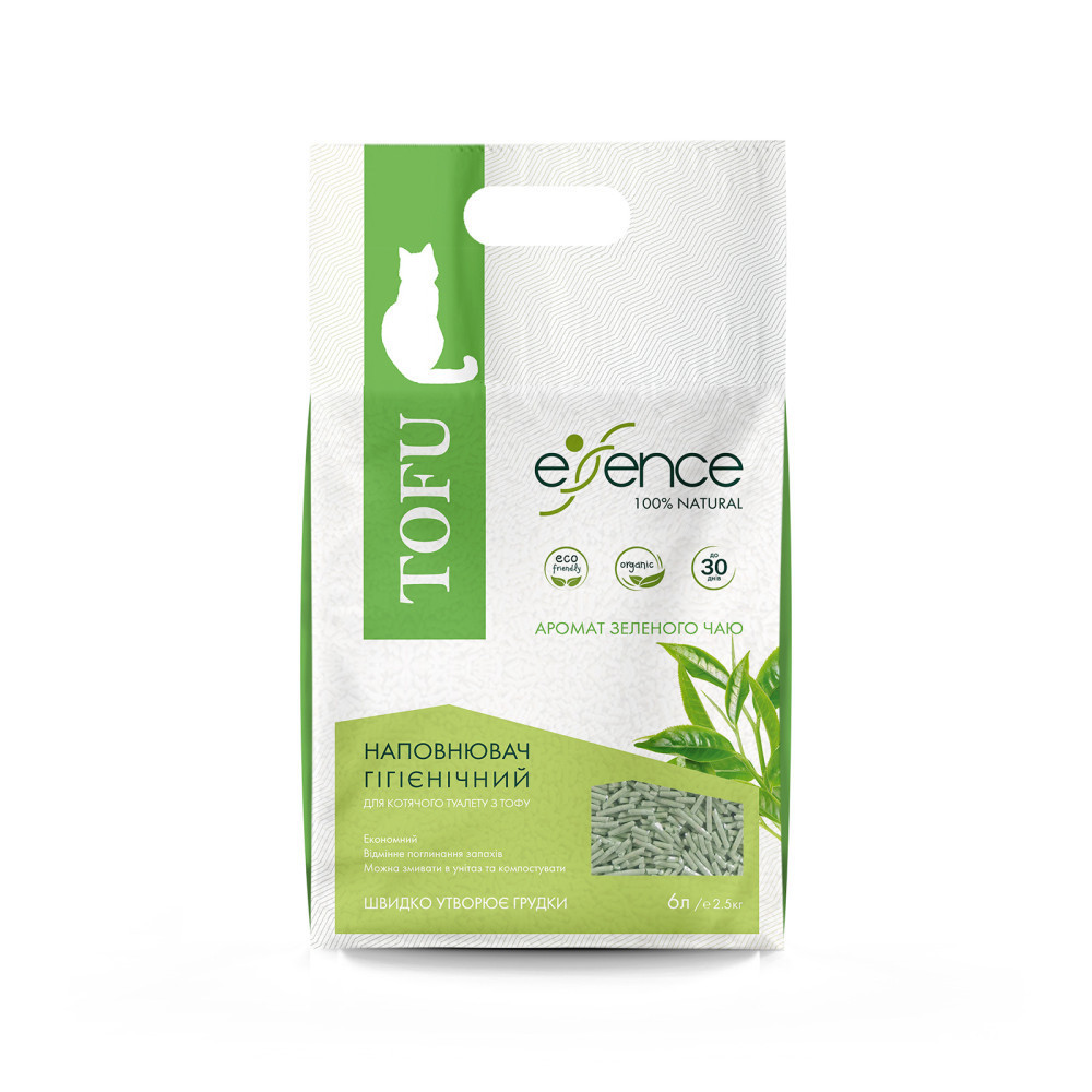 Вдалий вибір наповнювача для котячого туалету позбавить вас від клопоту із неприємним запахом, а вашого котика – від дискомфорту, спричиненого жорсткими гранулами, неприродним шурхотом чи відразливим ароматом.Щоб улюбленець завжди робив свою справу «чисто», використовуйте соєвий наповнювачі Essence Tofu!Його особливості:100% натуральні рослинні інгредієнти – вироблено з пресованих соєвих волокон. Цей матеріал безпечний для здоров’я домашніх вихованців і людей.Супервисока поглинаюча здатність – 300%. Завдяки цьому швидко формуються міцні грудочки, які легко прибирати з котячого лотку.Використаний наповнювач можна утилізувати з органічними відходами відповідно до нормативних вимог/правил утилізації відходів.М’яка структура є лагідною для лапок вашого котика та не подразнює їх.Склад:спресована маса соєвих волокон, харчовий крохмаль, гуарова камедь, есенція зеленого чаю. Не містить шкідливих для здоров’я тварин та людей речовин. Без ГМО.Розмір гранули:2 ммМаса нетто:2.5 кгОб’єм:6 лСпосіб використання:засипте наповнювач шаром 5-6 см у чистий та сухий котячий лоток. Після використання туалету котом, видаліть лопаткою тверді відходи (екскременти) та грудочки в сміттєвий пакет або іншу ємкість. Додайте наповнювач до попереднього рівня. Вимийте руки після заповнення лотка. Рекомендуємо періодично проводити дезінфекцію лотка або котячого туалету, в якому використовується наповнювач.Поради щодо використання:якщо у вас не один кіт, рекомендується не збільшувати кількість наповнювача, а частіше видаляти використаний. Якщо вашому коту складно звикнути до нового наповнювача, то спробуйте в перший місяць змішувати його з попереднім наповнювачем у співвідношенні 50/50 %.