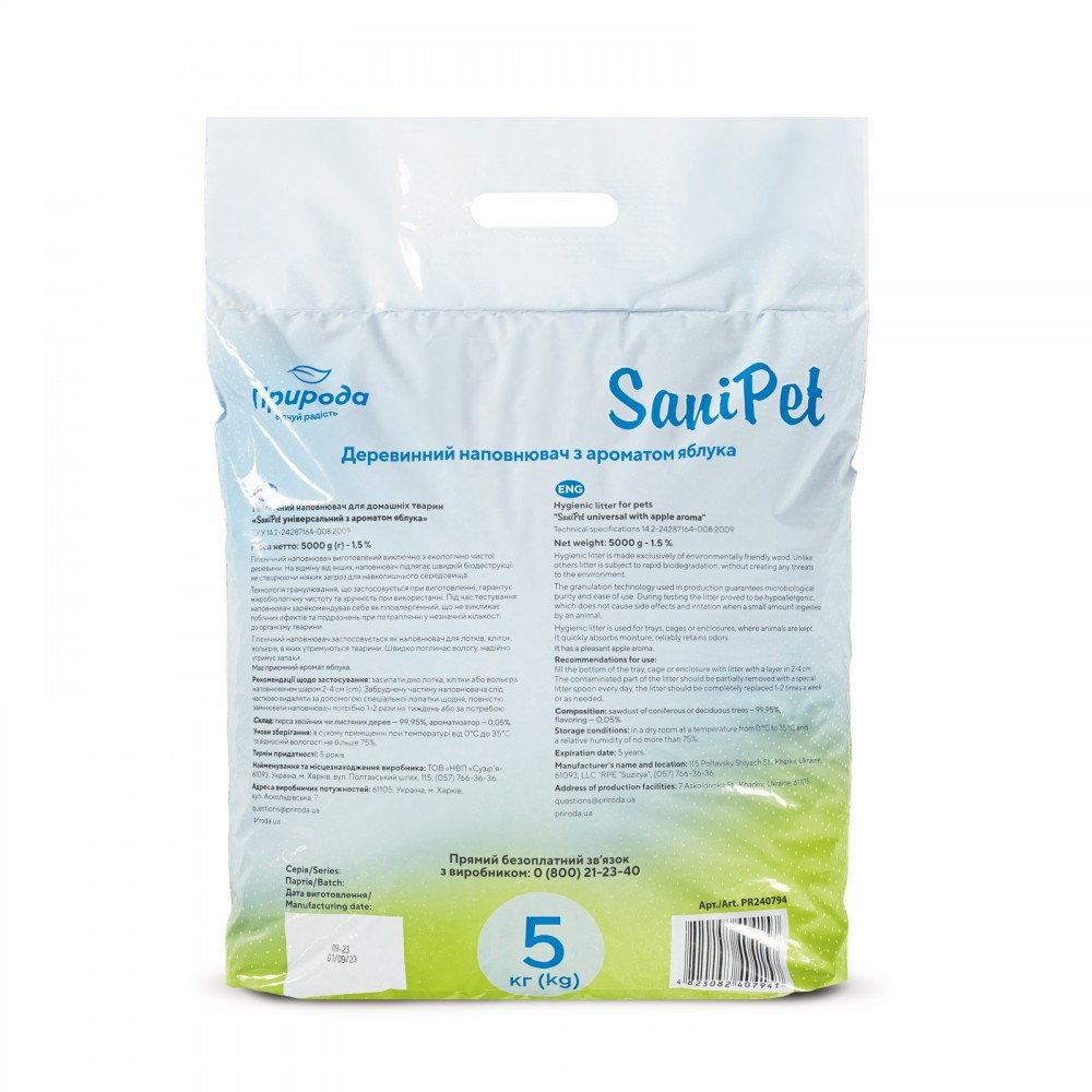 Деревинний наповнювач для лотків – дешевий та екологічний, є чудовим абсорбентом, швидко вбирає та утримує неприємні запахи.Якість продукту відповідає європейським стандартам. Сировина – виключно свіжа деревина без гнилизни та грибка. Природний фруктовий аромат приваблює тварин. Лоток після використання продукту дуже легко миється. Ваш улюбленець буде із задоволенням користуватися туалетом з таким наповнювачем.Рекомендації: Насипати наповнювач у лоток шаром 4-5 см. Щонайменше 1 раз на добу прибирати тверді екскременти і грудочки. При потребі досипати наповнювач у лоток або піддон. За наявності підлоги з підігрівом використовувати теплоізоляцію.Продукт на 100% натуральний, не містить хімічних добавок, завдяки дезинфікуючим властивостям деревини хвойних порід уповільнює розвиток патогенних мікроорганізмів. Для виготовлення використовується виключно дрібна тирса без великих шматків кори та деревини, тому якщо тварина випадково проковтне наповнювач, це не завдасть шкоди. Заокруглені гранули не травмують лапи, не створюють пил, мають приємний аромат яблука. Наповнювач особливо рекомендований кошенятам, яких тільки-но починають привчати до лотка.Склад: деревна тирса, ароматизатор «яблуко».Умови зберігання:У сухому приміщенні при температурі від 0 до 30 °С та відносній вологості не більше 75%.Термін придатності:5 роківВага: 5 кг