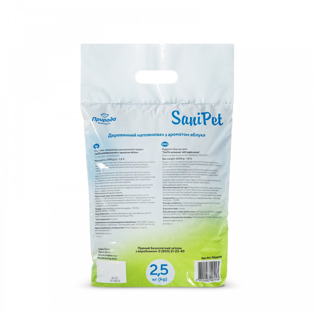 Деревинний наповнювач для лотків – дешевий та екологічний, є чудовим абсорбентом, швидко вбирає та утримує неприємні запахи.Якість продукту відповідає європейським стандартам. Сировина – виключно свіжа деревина без гнилизни та грибка. Природний фруктовий аромат приваблює тварин. Лоток після використання продукту дуже легко миється. Ваш улюбленець буде із задоволенням користуватися туалетом з таким наповнювачем.Рекомендації: Насипати наповнювач у лоток шаром 4-5 см. Щонайменше 1 раз на добу прибирати тверді екскременти і грудочки. При потребі досипати наповнювач у лоток або піддон. За наявності підлоги з підігрівом використовувати теплоізоляцію.Продукт на 100% натуральний, не містить хімічних добавок, завдяки дезинфікуючим властивостям деревини хвойних порід уповільнює розвиток патогенних мікроорганізмів. Для виготовлення використовується виключно дрібна тирса без великих шматків кори та деревини, тому якщо тварина випадково проковтне наповнювач, це не завдасть шкоди. Заокруглені гранули не травмують лапи, не створюють пил, мають приємний аромат яблука. Наповнювач особливо рекомендований кошенятам, яких тільки-но починають привчати до лотка.Склад: деревна тирса, ароматизатор «яблуко».Умови зберігання:У сухому приміщенні при температурі від 0 до 30 °С та відносній вологості не більше 75%.Термін придатності:5 роківВага: 2,5 кг