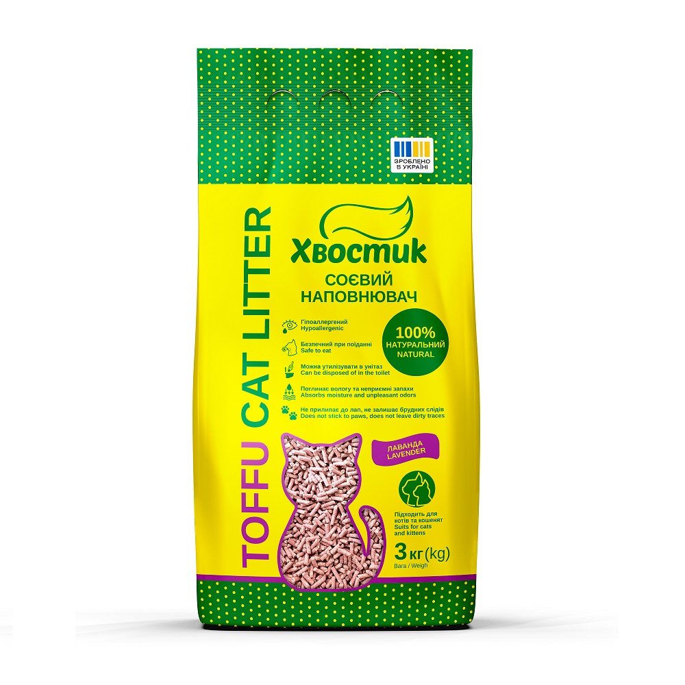 Соєвий наповнювач ТМ «Хвостик»– наповнювач, виготовлений з натуральної сировини, відзначається відмінною здатністю поглинати вологу і формувати грудочки, що робить прибирання легким та зручним. Його 100% натуральний склад без хімічних добавок не лише безпечний для здоров’я тварин, але й повністю біорозкладний, що робить продукт дружнім до навколишнього середовища. Наповнювач ефективно запобігає поширенню неприємних запахів та бактерій, забезпечуючи свіжість та гігієнічність у приміщенні.Переваги:- 100% натуральні складові- Швидко поглинає вологу- Формує грудочки, які легко прибирати без розсипання- Дбайливий до ніжних лапок котів, не викликає подразнень-Не розноситься за лапками, не залишає брудних слідів- Безпечний при поїданні-Економне використанняІнструкція щодо використання:Насипте наповнювач у сухий чистий лоток шаром не менше 5 см.Регулярно прибирайте грудки, що утворились. Грудки можна утилізувати в унітаз (для запобігання засмічення каналізаційних труб рекомендуємо змивати в унітаз невеликі порції наповнювача).По мірі необхідності досипайте наповнювач до рівня 5 см.Перемішуйте вміст лотка раз в 1-2 дняВага: 3 кгАромат:лаванда