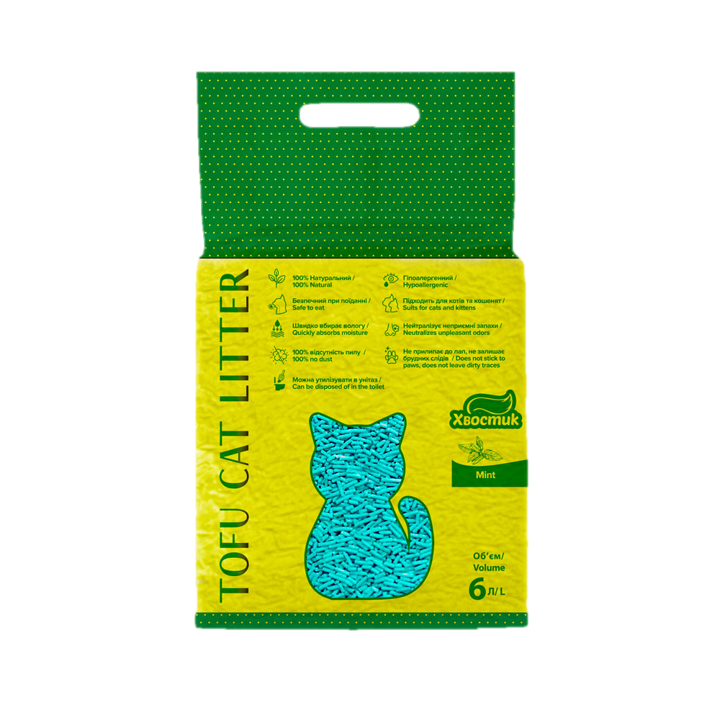 Соєвий наповнювач Тофу Хвостик з ароматом м’яти, 6 літрів (2,6 кг)Основні переваги:Наповнювач Тофу – спресовані гранули із соєвих волокон, які поглинають велику кількість вологи;100% натуральний;Повна відсутність пилу за рахунок вакуумного пакування;Не розноситься за лапками, не залишає брудних слідів;Нешкідливий при попаданні у шлунок (може використовуватися для найменших вихованців);Гіпоалергенний (для тварин та людей);Волоконна структура забезпечує якісне з’єднання гранул, утворюючи грудку та блокуючи запах усередині, а ароматичні добавки забезпечують приємний м’який аромат;Після формування грудки не розсипаються, мають форму пірамідки;Використані гранули можна змивати в унітаз.Запобіжні заходи:Не змивати більше 1 грудки за раз.Якщо потрібно змити дві або більше грудок, змивайте їх окремо і в проміжках між грудками робіть один холостий злив води.Спосіб застосування:1. Засипте гранули наповнювача Хвостик у лоток шаром 3-4 см;2. Щодня видаляйте грудочки, що утворилися. Чим частіше ви це робите, тим краще наповнювач утримує запах;3. Досипайте невелику кількість наповнювача, щоб підтримати необхідний рівень.Об’єм: 6 літрів.Вага: 2,6 кг.Аромат – м’ята.