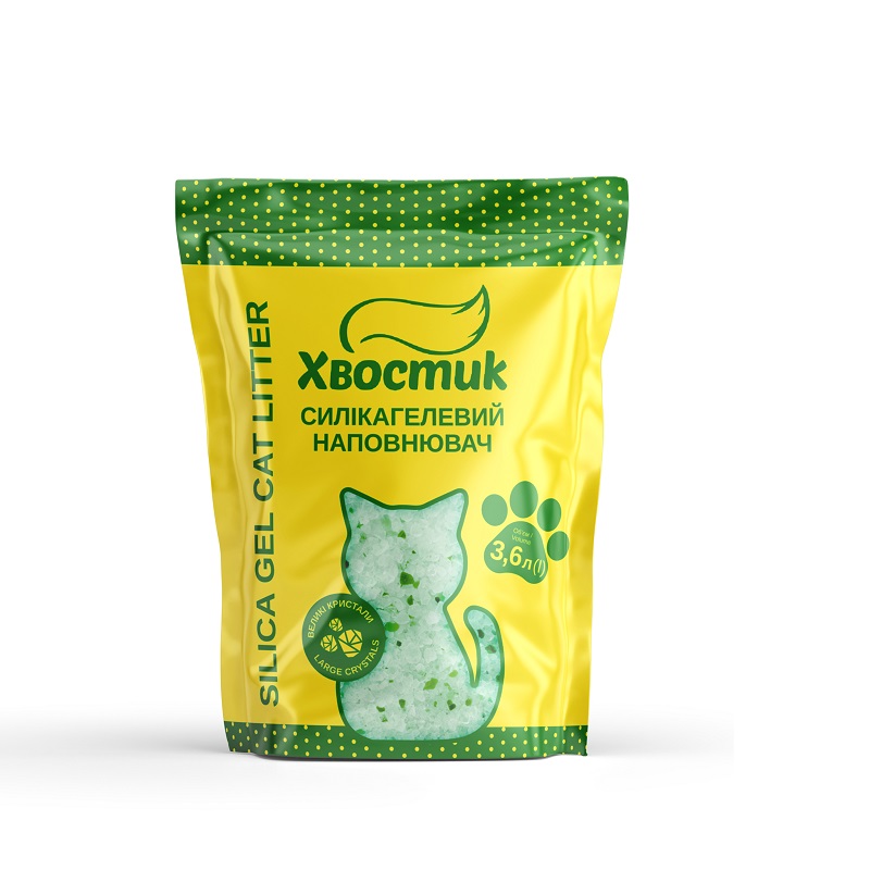 Силікагель – це висушений гель полікремнієвої кислоти (SiO2), який хімічно складається з тієї ж сполуки, що й звичайний пісок, але є високопористим тілом, тому має велику площу поверхні (800 м²/1 г). Завдяки цій властивості силікагель має унікальну абсорбуючу (вбираючу) здатність. Волога і запах зникають у силікагелі миттєво, але сам наповнювач ніколи не перетворюється на в’язку масу і не прилипає до котячих лап, а отже, не розноситься по дому.Силікагель – це гігієнічний наповнювач, він чудово справляється з будь-якими бактеріями, підтримуючи чистоту в будинку та охороняючи здоров’я кота. В середньому один пакет 3.6 л силікагелевого наповнювача Хвостик розрахований на 3 тижні для одного кота. На цей час ви забуваєте про неприємний запах і зайвий клопіт по догляду за домашньою твариною. Дрібні зелені гранули додають силікагелю Хвостик естетичності і є універсальними як для котів, так і для кішок.Інструкція із застосування:1. Наповніть сухий та чистий туалет силікагелевим наповнювачем (шар від 3 до 5 см).2. Регулярно видаляйте тверді відходи.3. Перемішуйте вміст лотка раз на 1-2 дні.4. Не рідше 1 разу на 3-4 тижні повністю замінюйте наповнювач на свіжий.5. Щоб уникнути забруднення каналізаційних стоків, не викидайте використаний силікагелевий наповнювач в унітаз.Вага: 1,35 кгРозмір гранули: 1-8 мм.