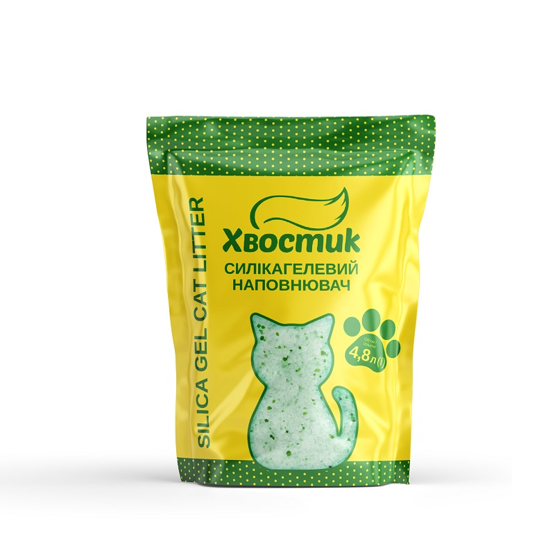 Силікагель – це висушений гель полікремнієвої кислоти (SiO2), який хімічно складається з тієї ж сполуки, що й звичайний пісок, але є високопористим тілом, тому має велику площу поверхні (800 м²/1 г). Завдяки цій властивості силікагель має унікальну абсорбуючу (вбираючу) здатність. Волога і запах зникають у силікагелі миттєво, але сам наповнювач ніколи не перетворюється на в’язку масу і не прилипає до котячих лап, а отже, не розноситься по дому. Завдяки дрібній фракції силікагелевого наповнювача Хвостик (0,5-2 мм) більше не страшно ходити по дому босоніж (не коле ноги), а також можна не переживати, що чутливі лапки кота травмуються. Даний силікагель можна також використовувати для маленьких вихованців, тому що дрібну гранулу складніше з’їсти, але ми рекомендуємо робити це з обережністю, тому що поїдання силікагелю небезпечне для здоров’я котика.Силікагель – це гігієнічний наповнювач, він чудово справляється з будь-якими бактеріями, підтримуючи чистоту в будинку та охороняючи здоров’я кота. В середньому один пакет 4.8 л силікагелевого наповнювача Хвостик розрахований на 4 тижні для одного кота. На цей час ви забуваєте про неприємний запах і зайвий клопіт по догляду за домашньою твариною. Дрібні зелені гранули додають силікагелю Хвостик естетичності і є універсальними як для котів, так і для кішок.Інструкція із застосування:1. Наповніть сухий та чистий туалет силікагелевим наповнювачем (шар від 3 до 5 см).2. Регулярно видаляйте тверді відходи.3. Перемішуйте вміст лотка раз на 1-2 дні.4. Не рідше 1 разу на 3-4 тижні повністю замінюйте наповнювач на свіжий.5. Щоб уникнути забруднення каналізаційних стоків, не викидайте використаний силікагелевий наповнювач в унітаз.Вага: 1,82 кг
