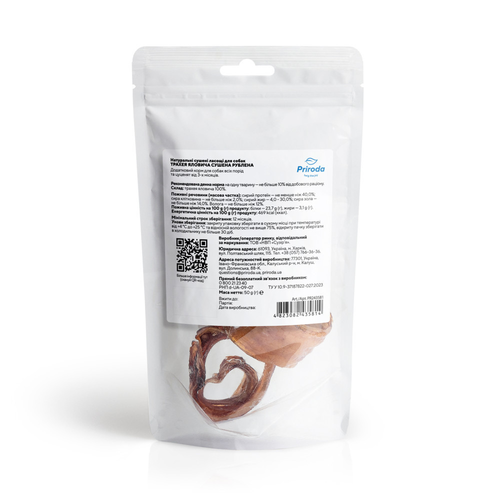 Трахея яловича – делікатес для песиків! Вона хрустка та запашна, жувати її легко і приємно. Особливо рекомендуються ці ласощі собакам маленьких та середніх порід. Трахея доповнює раціон улюбленців натуральними протеїнами, колагеном. Також ласощі чудово задовольняють інстинкт жування і зміцнюють м’язи щелеп.Трахея яловича– натуральний продукт без будь-яких додатків. Трахея пройшла спеціальну термообробку, в процесі якої було збережено максимум корисних речовин, зокрема, протеїни, які є «будівельним матеріалом» для організму, колаген, що зміцнює суглоби, вітаміни групи B, D, калій, марганець, йод, залізо, що сприяють обміну речовин, оновленню клітин крові, зміцненню опорно-рухового апарату, нормалізації функціонування ендокринної системи. Трахея є дієтичним продуктом, що не містить жиру та м’яса. Розжовування продукту очищує зуби від нальоту, масажує ясна, розвиває м’язи щелеп. Рекомендується обережно давати собакам великих порід, які схильні ковтати смаколики – ковтання цілого хрящового кільця може блокувати стравохід.Характеристики продукту:100% натуральнийгіпоалергенний*підходить собакам всіх порід (великим давати з обережністю)сприяє поліпшенню стану опорно-рухового апарату, нормалізує обмін речовин, поліпшує роботу ендокринної системидля швидкого споживанняне містить ГМО та глютену.*монобілковий смаколик, гіпоалергенний для всіх собак із гарним засвоєнням протеїну яловичиниСклад: трахея яловичаРекомендованаденна норма на одного улюбленця – не більше 10 % від добового раціону