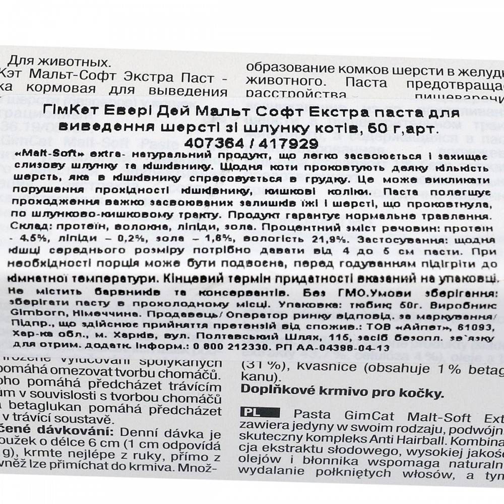 GimCat Every Day Malt-Soft Paste Extra – паста для виведення грудочок шерсті (безоарів) у котів.Вона містить унікальний комплекс подвійної дії. Ефективна комбінація екстракту солоду, високоякісних олій і баластних речовин сприяє виведенню проковтнутої шерсті природним шляхом, і зменшує утворення грудочок шерсті в шлунку улюбленця. Паста запобігає розладам травлення, що виникають через накопичення шерсті в травному тракті кота, а інактивована дріжджова культура (містить 1% бета-глюкану) запобігає запальним процесам в шлунково-кишковому тракті.Рекомендації щодо годування:6 см пасти на день, безпосередньо з тюбика або разом з кормом (1 см пасти = приблизно 0,5 г). Рекомендується використовувати добавку кімнатної температури. Тривалість застосування не обмежена.ГімКет Евері Дей Мальт Софт Екстра паста для виведення шерсті зі шлунку котів призначена для дорослих котів всіх порід, не призначена для кошенят, не призначена для котів, які мають чутливість до одного або декількох інгредієнтів кормової добавкиСклад: екстракт солоду (43,7%), ріпакова олія, емульгатори (лецитин, гліцерол моностеарат), інактивована дріжджова культура Saccharomyces cerevisiae (5,5%), целюлоза (4%), загущувач (гуміарабік), лляна олія (2,5% ), стабілізатор (діоксид кремнію), антиоксиданти (бутилгідрокситолуол, аскорбілпальмітат, лимонна кислота).