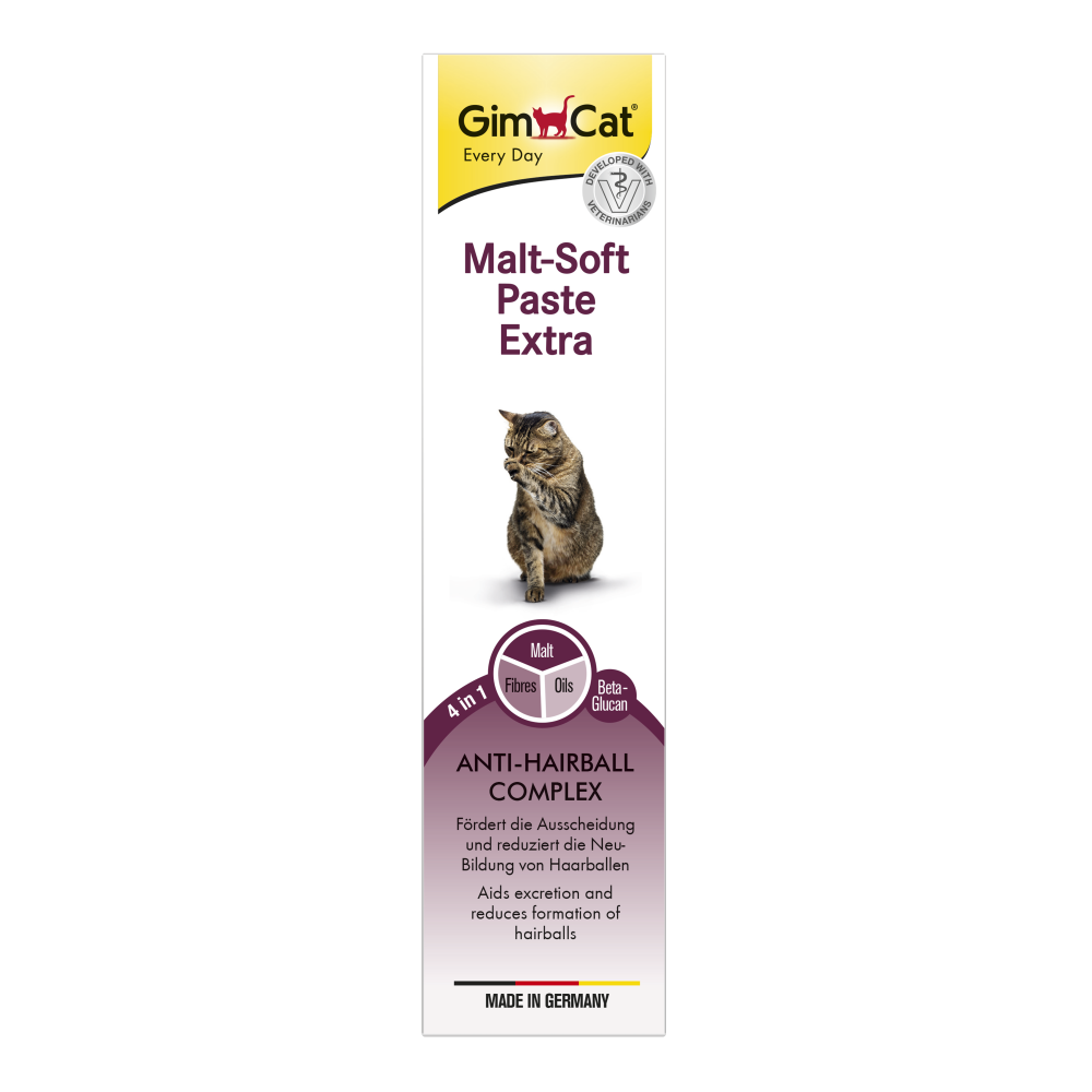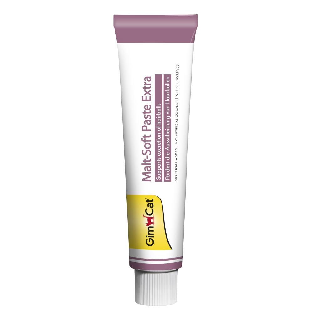 GimCat Every Day Malt-Soft Paste Extra – паста для виведення грудочок шерсті (безоарів) у котів.Вона містить унікальний комплекс подвійної дії. Ефективна комбінація екстракту солоду, високоякісних олій і баластних речовин сприяє виведенню проковтнутої шерсті природним шляхом, і зменшує утворення грудочок шерсті в шлунку улюбленця. Паста запобігає розладам травлення, що виникають через накопичення шерсті в травному тракті кота, а інактивована дріжджова культура (містить 1% бета-глюкану) запобігає запальним процесам в шлунково-кишковому тракті.Рекомендації щодо годування:6 см пасти на день, безпосередньо з тюбика або разом з кормом (1 см пасти = приблизно 0,5 г). Рекомендується використовувати добавку кімнатної температури. Тривалість застосування не обмежена.ГімКет Евері Дей Мальт Софт Екстра паста для виведення шерсті зі шлунку котів призначена для дорослих котів всіх порід, не призначена для кошенят, не призначена для котів, які мають чутливість до одного або декількох інгредієнтів кормової добавкиСклад: екстракт солоду (43,7%), ріпакова олія, емульгатори (лецитин, гліцерол моностеарат), інактивована дріжджова культура Saccharomyces cerevisiae (5,5%), целюлоза (4%), загущувач (гуміарабік), лляна олія (2,5% ), стабілізатор (діоксид кремнію), антиоксиданти (бутилгідрокситолуол, аскорбілпальмітат, лимонна кислота).