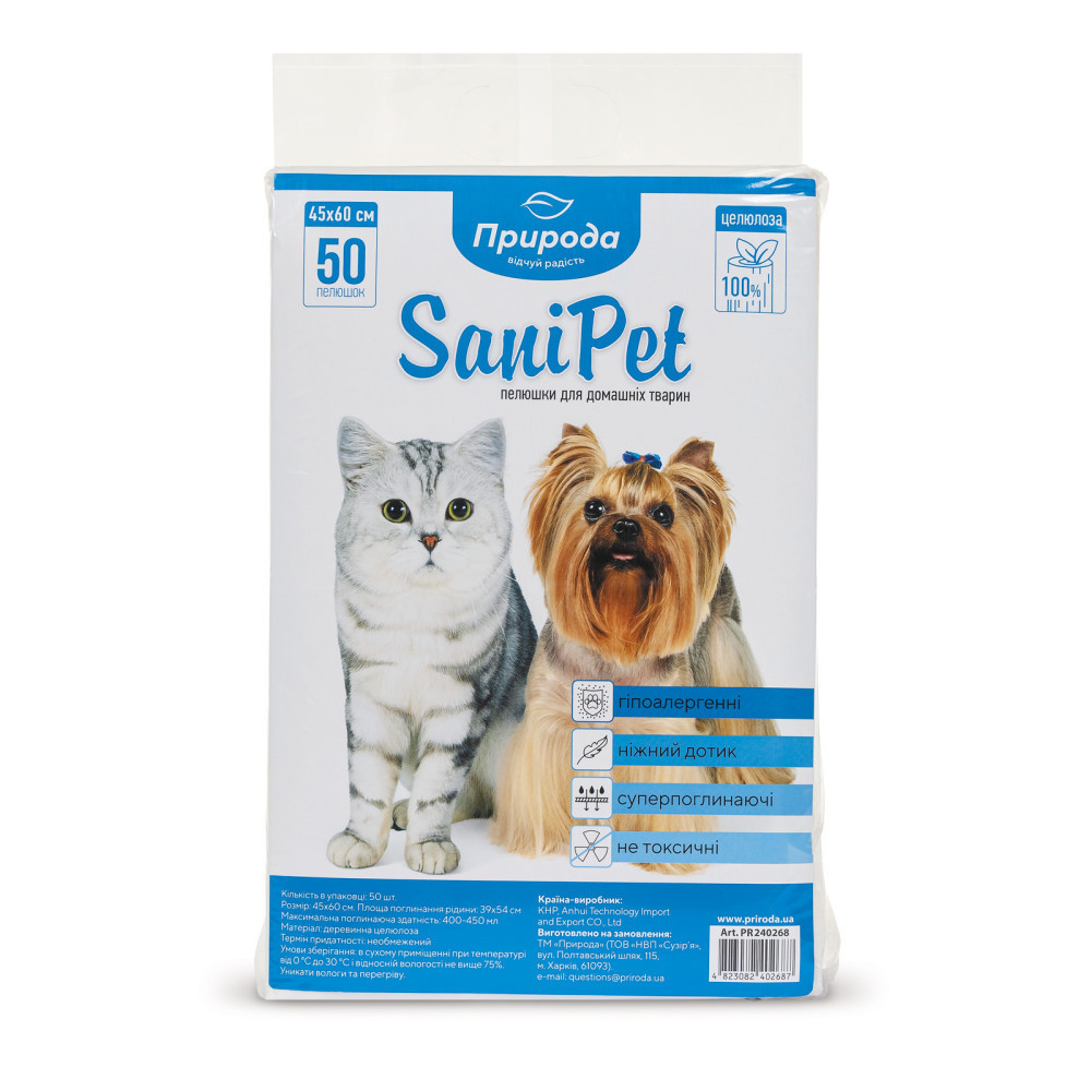 Пелюшки гігієнічні Природа SaniPet для собак з целюлоза 45×60 см/50 шт