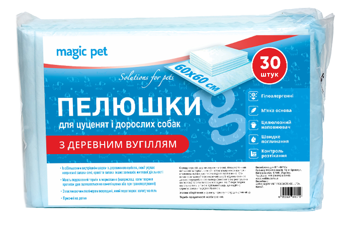 Magic Pet – це щоденні пелюшки для цуценят, собак та інших домашніх тварин для надійного захисту чистоти вашого будинку! Верхній шар пелюшки виготовлений з м’якого гіпоалергенного матеріалу, нижній – нековзка поліетиленова плівка, шо перешкоджає протіканню. Поглинаючий шар містить високоякісну целюлозу з полімером всередині, який перетворює вологу на гель.
