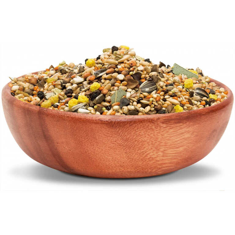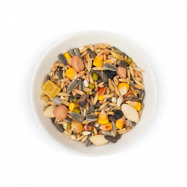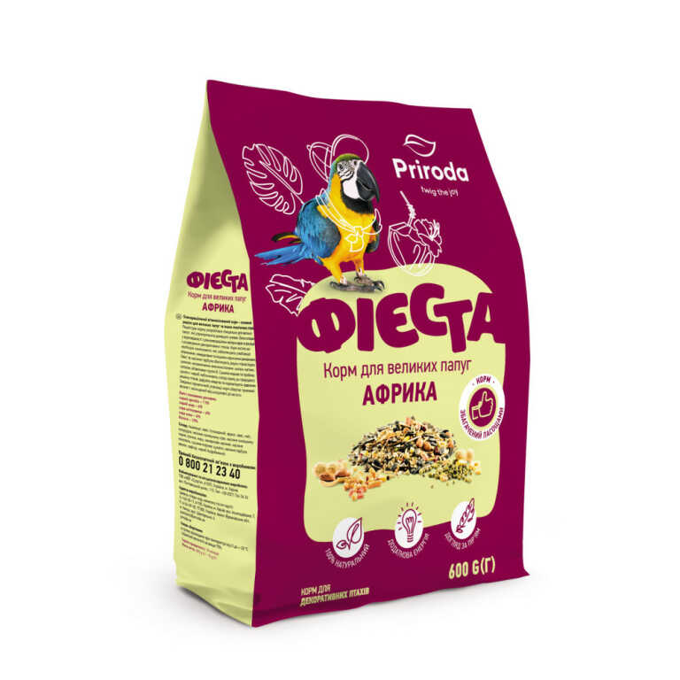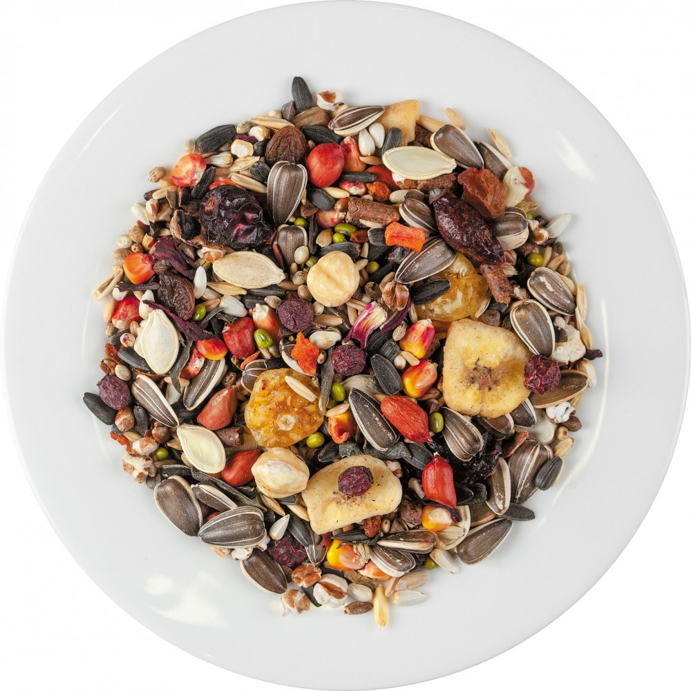 Рецептура корму розроблена спеціально для великих папуг, які утримуються в домашніх умовах. Вона складена на основі найновітніших світових норм годування, а також відповідно рекомендацій провідних фахівців з розведення та утримання декоративних птахів.Раціон має унікальний, надзвичайно різноманітний склад, який включає інгредієнти з природного місця існування улюбленців. До складу корму увійшло 27 інгредієнтів, серед яких відбірне зерно, сушені фрукти, ягоди, горіхи, квіти, морепродукти, а також рідкісні делікатеси – абіссінський нуг, амарант, бананові чіпси, сушений фізаліс. Корм збагачено інгредієнтами, які зміцнюють здоров’я, роблять оперення яскравим і прискорюють линьку.Чому треба обрати корм:ЕКЗОТИЧНІ ІНГРЕДІЄНТИ. Раціон збагачено фізалісом, банановими чипсами, неочищеним рисом, бобами мунг.ОПТИМАЛЬНИЙ РОЗМІР ІНГРЕДІЄНТІВ. Забезпечує максимальну зручність поїдання.ЯСКРАВЕ ТА БЛИСКУЧЕ ОПЕРЕННЯ. Завдяки моркві, шипшині, фундуку, гібіску та обліписі.ЗДОРОВА ЕНДОКРИННА СИСТЕМА. Ламінарія — багате природне джерело йодуСклад: овес голозерний, маїс, насіння соняшнику чорного, насіння соняшнику сірого, ячмінь, гречка, сафлор, сорго біле, арахіс, насіння конопель, боби мунг, фрукти гранульовані, насіння гарбуза, рис неочищений, пшениця повітряна, глід, виноград сушений, бананові чіпси, фізаліс сушений, подрібнена ламінарія, насіння розторопші, кероб подрібнений, фундук, шипшина, гібіск, морква сушена, обліпиха сушена.