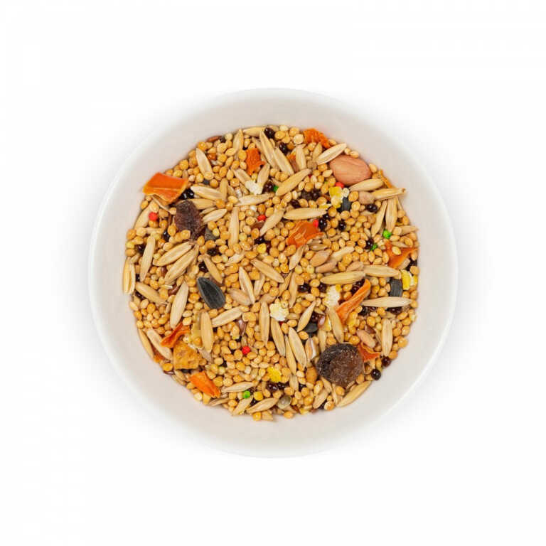 Рецептура корму розроблена спеціально для канарок та інших декоративних птахів, які утримуються в домашніх умовах. Вона складена на основі найновітніших світових норм годування, а також рекомендацій провідних світових фахівців з розведення та утримання канарок.Унікальний за складом, корм включає відбірне зерно, насіння, смаколики, а також інгредієнти з природного ареалу проживання канарок. Рецептура гармонійно поєднала 13 інгредієнтів, серед яких високоякісне зерно, сушені фрукти, овочі, а також улюблені делікатеси – абіссінський нуг, кунжут білий, сушена паприка, чумиза. Корм збагачено інгредієнтами, які зміцнюють здоров’я, роблять оперення яскравим і прискорюють линьку.Чому треба обрати корм:КОРИСНЕ РІЗНОМАНІТНЕ ХАРЧУВАННЯ. Завдяки поживним суперфудам: амаранту, кунжуту, насінню льону.ПІДТРИМКА ІМУНІТЕТУ ТА ЗДОРОВИЙ КРОВООБІГ. Завдяки рапсу та вівсу, що містять 10 незамінних амінокислот, калій, мідь, йод.СТІЙКІСТЬ ДО СТРЕСІВ. Забезпечується завдяки амаранту та квітам ромашки.ПІДТРИМКА РОБОТИ ШКТ. Завдяки фенхелю, насінню льону та конопель, що містять альфа-лінолеву кислоту, рослинні олії.Склад: канаркове насіння, рапс, просо жовте, просо червоне, вівсяна крупа, насіння льону, чумиза, абіссінський нуг, кунжут білий, сушена паприка, сушена морква, насіння конопель, сушене яблуко.