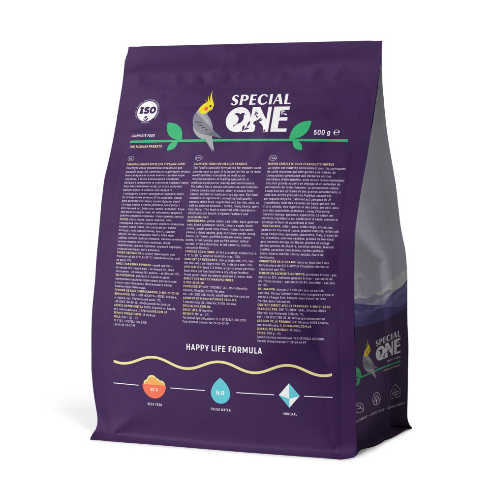 Рецептура корму розроблена спеціально для середніх папуг, які утримуються в домашніх умовах. Вона складена на основі найновітніших світових норм годування, а також рекомендацій провідних світових фахівців з розведення та утримання середніх папуг.Корм має унікальний склад, до якого включені відбірне зерна та насіння, інші продукти з природного ареалу проживання середніх папуг. До складу корму увійшло 25 інгредієнтів, серед яких високоякісне зерно, сушені фрукти, овочі та ягоди, горіхи, а також улюблені делікатеси – абіссінський нуг, боби мунг, полба, еспарцет. Корм збагачено інгредієнтами, які зміцнюють здоров’я, роблять оперення яскравим і прискорюють линьку.Чому треба обрати корм:ЗДОРОВЕ ХАРЧУВАННЯ БЕЗ ЗАЙВИХ КАЛОРІЙ. Завдяки сушеним фруктам та овочам, насінню еспарцету, конопель та гарбуза.ПОВНИЙ КОМПЛЕКС ВІТАМІНІВ. Завдяки сушеним ягодам, квітам та овочами.ГАРНЕ ТРАВЛЕННЯ ТА ЧУДОВЕ САМОПОЧУТТЯ. Завдяки горобині та ромашці, які мають заспокійливу дію та виводять з організму токсини.СУПЕРПРИВАБЛИВИЙ СМАК. Завдяки абіссінському нугу, арахісу, сушеним яблукам та барбарису.Склад: просо жовте, просо червоне, овес голозерний, насіння соняшнику, канаркове насіння, просо чорне, абіссінський нуг, полба, еспарцет, маїс, насіння льону, арахіс, сушене яблуко, насіння соняшнику сірого, боби мунг, сафлор, насіння гарбуза очищене, насіння конопель, сушена морква, повітряна пшениця, кероб подрібнений, сушена горобина, сушений барбарис, сушений виноград, квіти ромашки.