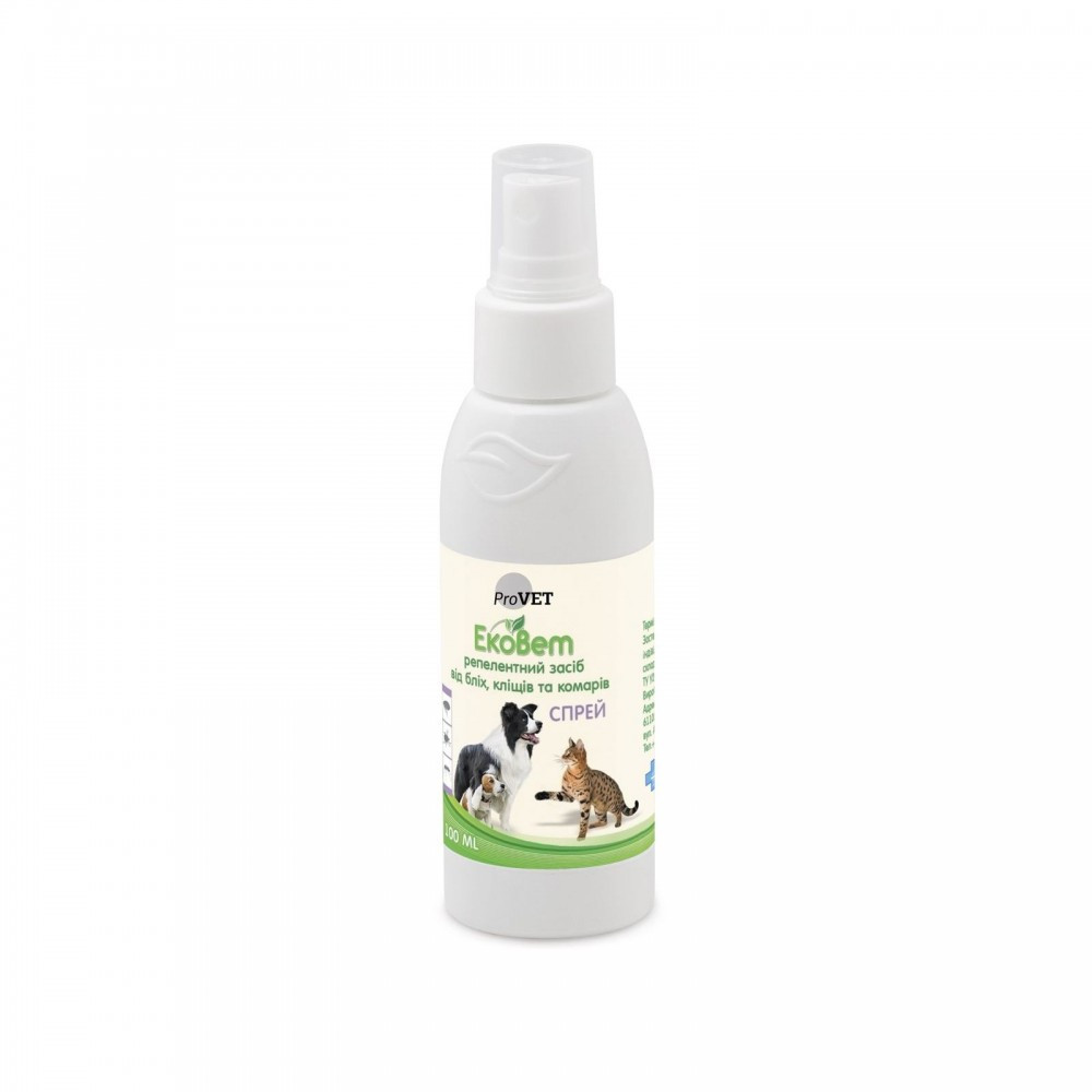 Репелентний спрей ЕкоВет для зовнішнього застосування для котів та собак (100 мл) захищає від найбільш розповсюджених видів ектопаразитів та дбає про бездоганний зовнішній вигляд вашого улюбленця.Засіб має виражений репелентний ефект проти бліх, вошей, кліщів та переносників небезпечних захворювань: комарів, москітів та мух. Ефект досягається завдяки поєднанню ретельно підібраних, виключно природних компонентів: олій герані, маргози, гвоздики та екстракту ванілі.Складові компоненти продукту мають властивість доповнювати та посилювати дію одне одного, за рахунок чого досягається косметичний ефект, маскується неприємний запах від тварин, покращується стан шкіри і шерсті. У випадках подразнень та мікротравм на шкірі засіб сприяє швидшому загоєнню та відновленню епідермісу.Спосіб застосування:Перед обробкою флакон ретельно струшують. Однією рукою засіб розпилюють на тулуб тварини з відстані 10-20 см, другою рукою піднімають шерсть тварини проти напрямку росту таким чином, щоб засобом обробити не тільки шерсть до повного зволоження, а й шкіру. Рекомендується обробити також подушечки лап. При обробці слід запобігати потраплянню засобу в очі та на слизові оболонки.Умови зберігання:Зберігати в сухому, недоступному для дітей і тварин місці, окремо від продуктів харчування та кормів при температурі від 0 °С до 25 °С.Склад:Олія герані, олія маргози, олія гвоздики та екстракт ванілі, салімікс, дистильована вода, спирт ізопропіловий.Протипоказання:Не застосовувати тваринам з індивідуальною чутливістю до складових компонентів продукту.Рекомендований вік:від 4 тижнів.Термін придатності:2 роки.Форма випуску:Полімерний флакон об’ємом 100 мл з розпилювачем.Технічні умови (ТУ):ТУ У 20.2-37187822-018:2019. Сертифікат: ISO 9001:2015.