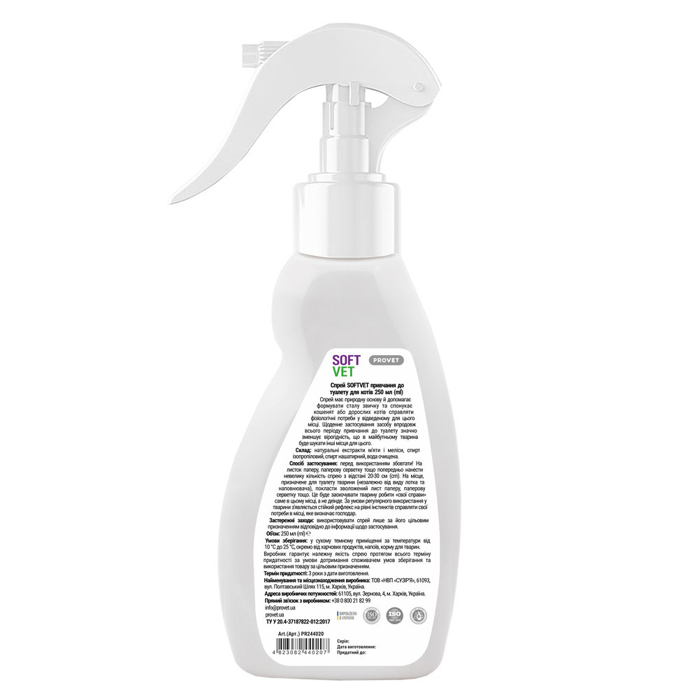 Спрей має природну основу й допомагає формувати сталу звичку та спонукає кошенят або дорослих котів справляти фізіологічні потреби у відведеному для цього місці. Щоденне застосування засобу впродовж всього періоду привчання до туалету значно зменшує вірогідність, що в майбутньому тварина буде шукати інші місця для цього.Склад:натуральні екстракти м’яти і меліси, спирт ізопропіловий, спирт нашатирний, вода очищена.Спосіб застосування:перед використанням збовтати! На листок паперу, паперову серветку тощо попередньо нанести невелику кількість спрею з відстані 20-30 см (cm). На місце, призначене для туалету тварини (незалежно від виду лотка та наповнювача), покласти зволожений лист паперу, паперову серветку тощо. Це буде заохочувати тварину робити «свої справи» саме в цьому місці, а не деінде. За умови регулярного використання у тварини з’являється стійкий рефлекс на рівні інстинктів справляти свої потреби в місці, яке визначає господар.Застережні заходи:використовувати спрей лише за його цільовим призначенням відповідно до інформації щодо застосування.