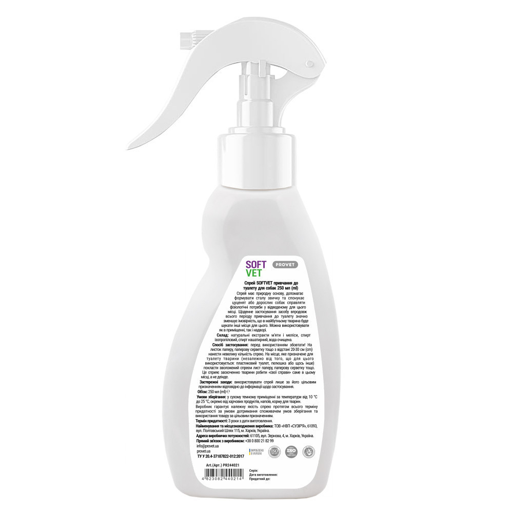 Спрей має природну основу, допомагає формувати сталу звичку та спонукає цуценят або дорослих собак справляти фізіологічні потреби у відведеному для цього місці. Щоденне застосування засобу впродовж всього періоду привчання до туалету значно зменшує імовірність, що в майбутньому тварина буде шукати інші місця для цього. Можна використовувати як в приміщенні, так і надворі.Склад:натуральні екстракти м’яти і меліси, спирт ізопропіловий, спирт нашатирний, вода очищена.Спосіб застосування:перед використанням збовтати! На листок паперу, паперову серветку тощо попередньо з відстані 20-30 см (cm) нанести невелику кількість спрею. На місце, яке призначене для туалету тварини (незалежно від того що для цього використовується ― пластиковий туалет, пелюшка або щось інше) покласти зволожений спреєм лист паперу, паперову серветку тощо. Це сприяє заохоченню тварини робити «свої справи» саме в цьому місці, а не деінде.Застережні заходи: використовувати спрей лише за його цільовим призначенням відповідно до інформації щодо застосування.