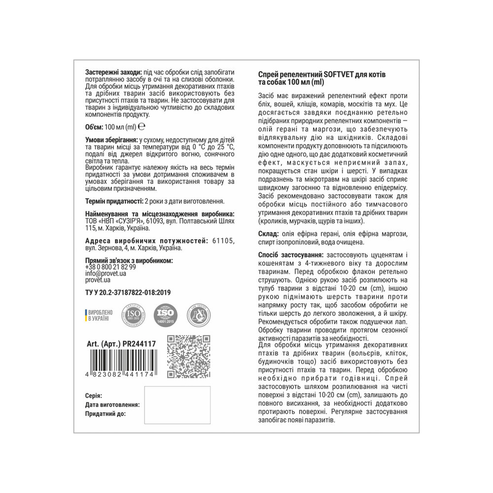 Засіб має виражений репелентний ефект проти бліх, вошей, кліщів та переносників небезпечних захворювань: комарів, москітів та мух. Це досягається завдяки поєднанню ретельно підібраних природних компонентів ― олій герані та маргози, що забезпечують відлякуючу дію на шкідників. Складові компоненти продукту мають властивість доповнювати та підсилювати дію одне одного, завдяки чому досягається додатковий косметичний ефект, маскується неприємний запах, покращується стан шкіри і шерсті. У випадках подразнень та мікротравм на шкірі засіб сприяє швидкому загоєнню та відновленню епідермісу.Склад:олія ефірна герані, олія ефірна маргози, спирт ізопропіловий, вода очищена.Спосіб застосування:застосовують цуценятам і кошенятам з 4-тижневого віку та дорослим тваринам. Перед обробкою флакон ретельно струшують. Однією рукою засіб розпилюють на тулуб тварини з відстані 10- 20 см (cm), іншою рукою піднімають шерсть тварини проти напрямку росту так, щоб засобом обробити не тільки шерсть до легкого зволоження, а й шкіру. Рекомендується обробити також подушечки лап. Обробку тварини проводити протягом сезонної активності паразитів за необхідності.