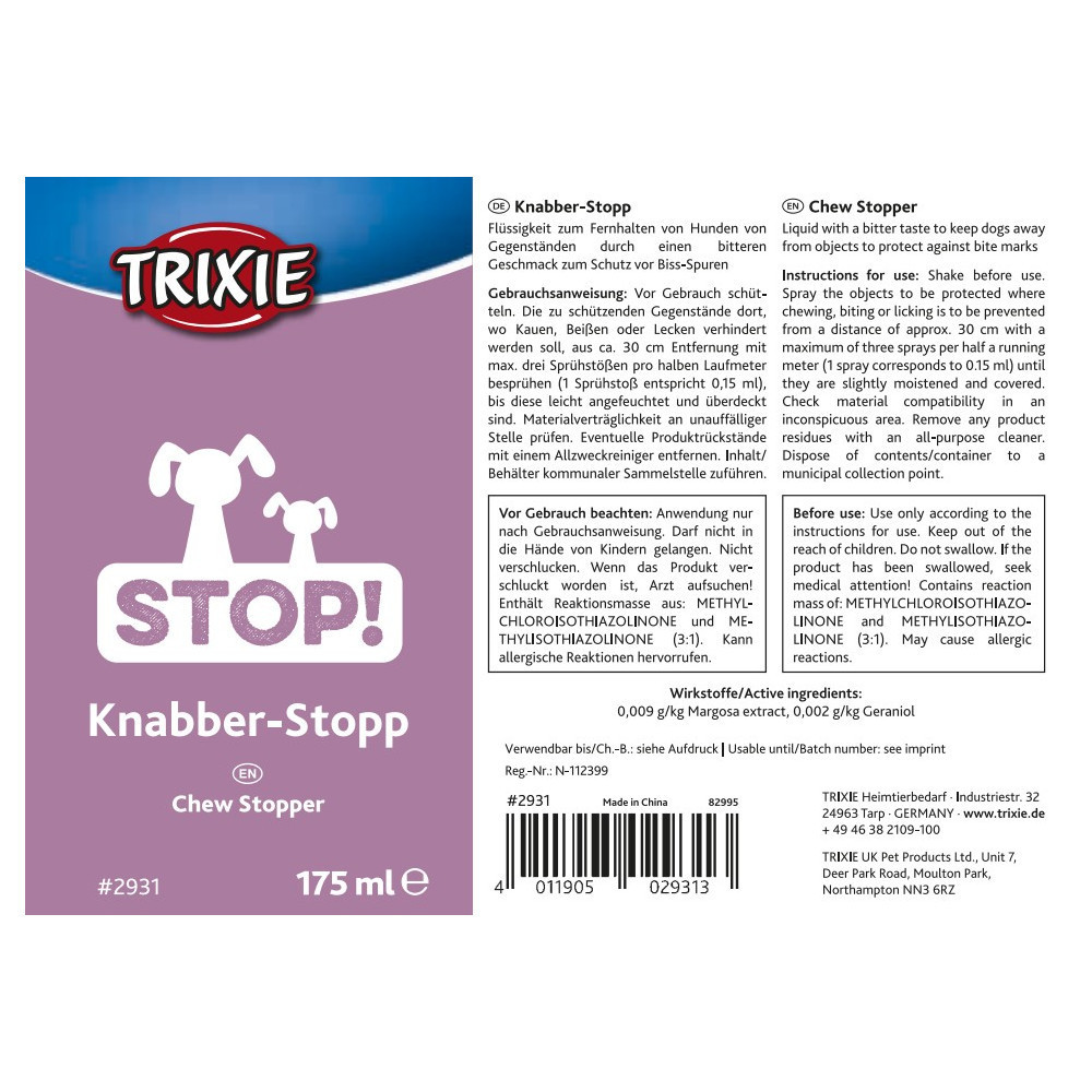 TRIXIE Knapper-Stopp – це ефективний засіб у формі спрею, з гірким смаком, розроблений для захисту ваших меблів, взуття та інших предметів від пошкоджень, спричинених жуванням, кусанням або лизанням собаками. Цей продукт допомагає відучити вашого улюбленця від небажаних звичок, зберігаючи ваші речі цілими та неушкодженими.Інструкція із застосування:перед використанням збовтати. Розпиліть засіб на об’єкти, що потрібно захистити від жування, кусання або лизання, з відстані приблизно 30 см, максимум трьома розпиленнями на кожні півметра (1 розпилення відповідає 0,15 мл), доки вони не стануть злегка вологими та покритими. Перевірте сумісність матеріалу на непомітній ділянці. Видаліть будь-які залишки продукту універсальним очисним засобом. Утилізуйте вміст/контейнер у муніципальний пункт збору.Перед використанням зверніть увагу:Використовуйте лише згідно з інструкцією із застосування. Зберігати в недоступному для дітей місці. Не ковтати. Якщо продукт був проковтнутий, зверніться за медичною допомогою! Містить реакційну масу: МЕТИЛХЛОРОІЗОТІАЗОЛІНОН та МЕТИЛІЗОТІАЗОЛІНОН (3:1). Може викликати алергічні реакції.Активні інгредієнти:0,009 г/кг екстракту маргози, 0,002 г/кг гераніолуОб’єм:175 мл