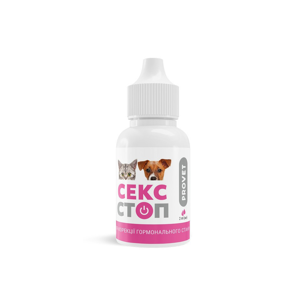 Препарат застосовують для затримки або переривання тічки у сук і кішок (на подальші вагітності негативно не впливає.) У кобелів і котів препарат гальмує статеву активність і регулює пов’язані з цим проблеми поведінки. Діючою речовиною препарату є синтетичний прогестаген — мегестролу ацетат.Властивість гормону гальмувати статеву охоту і овуляцію використовується для затримки тічки, зміщення часу настання, корекції статевої поведінки, а також з метою уникнення небажаного потомства. Повне відновлення репродуктивної функції відбувається через 2-3 місяці після припинення прийому препарату.Спосіб застосування:Перед використанням флакон із суспензією збовтати. «Сексстоп» вводять перорально з кормом або примусово на корінь язика в наступних дозах: Котам: При появі у котів ознак статевого збудження для заспокоєння — 5 крапель на 5 кг маси тіла тварини щодня протягом 2 тижнів, але не довше.Кішкам:Для переривання тічки:кішкам масою тіла 1-5 кг — 8 крапель щодня;кішкам масою тіла 6-10 кг — 10 крапель щодня протягом 8 діб з початку тічки.Не застосовувати, якщо з початку тічки минуло 2 доби. Рекомендовано переривати тічку не частіше двох разів на рік. Якщо неможливо визначити початок тічки, краще затримати, ніж переривати.Для затримки тічки:кішкам масою тіла 1-5 кг — 4 краплі;кішкам масою тіла 6-10 кг — 6 крапель кожні 2 тижні.Застосовують протягом часу, на який необхідно затримати тічку.Сукам: Для переривання тічки:20 крапель на кожні 5 кг маси тіла тварини, в перші 3 доби;з 4 по 10 добу приймати половину добової дози.Рекомендовано застосовувати не більше двох курсів на рік.Для затримки тічки:за 7–15 діб до початку тічки 6 крапель на кожні 5 кг маси тіла тварини щодня.Максимальний курс — 32 доби.Кобелям:Для зниження статевого збудження — 20 крапель на кожні 5 кг маси тіла тварини протягом 7 діб, починаючи не пізніше другої доби з початку статевого збудження.Умови зберігання:Зберігати у сухому темному, недоступному для дітей і тварин місці, окремо від продуктів харчування та кормів при температурі від 4 °С до 25 °С.Склад:1,0 мл препарату містить діючу речовину: мегестролу ацетат (синтетичний прогестаген) — 20 мг, допоміжні речовини.Протипоказання:Не застосовувати тваринам при захворюваннях статевої системи (піометра, метрит, ендометрит), пухлинах молочної залози, при діабеті, нестатевозрілим тваринам. Не використовувати під час вагітності та лактації. Не рекомендується застосовувати молодим самкам до першої тічки або як анестральну терапію при порушенні статевого циклу.Термін придатності:3 роки.Форма випуску:Полімерні флакони з крапельницею по 2,0 мл, упаковані в картонну коробку.РП № АВ-05373-01-14. Сертифікат: ISO 9001:2015, GMP.