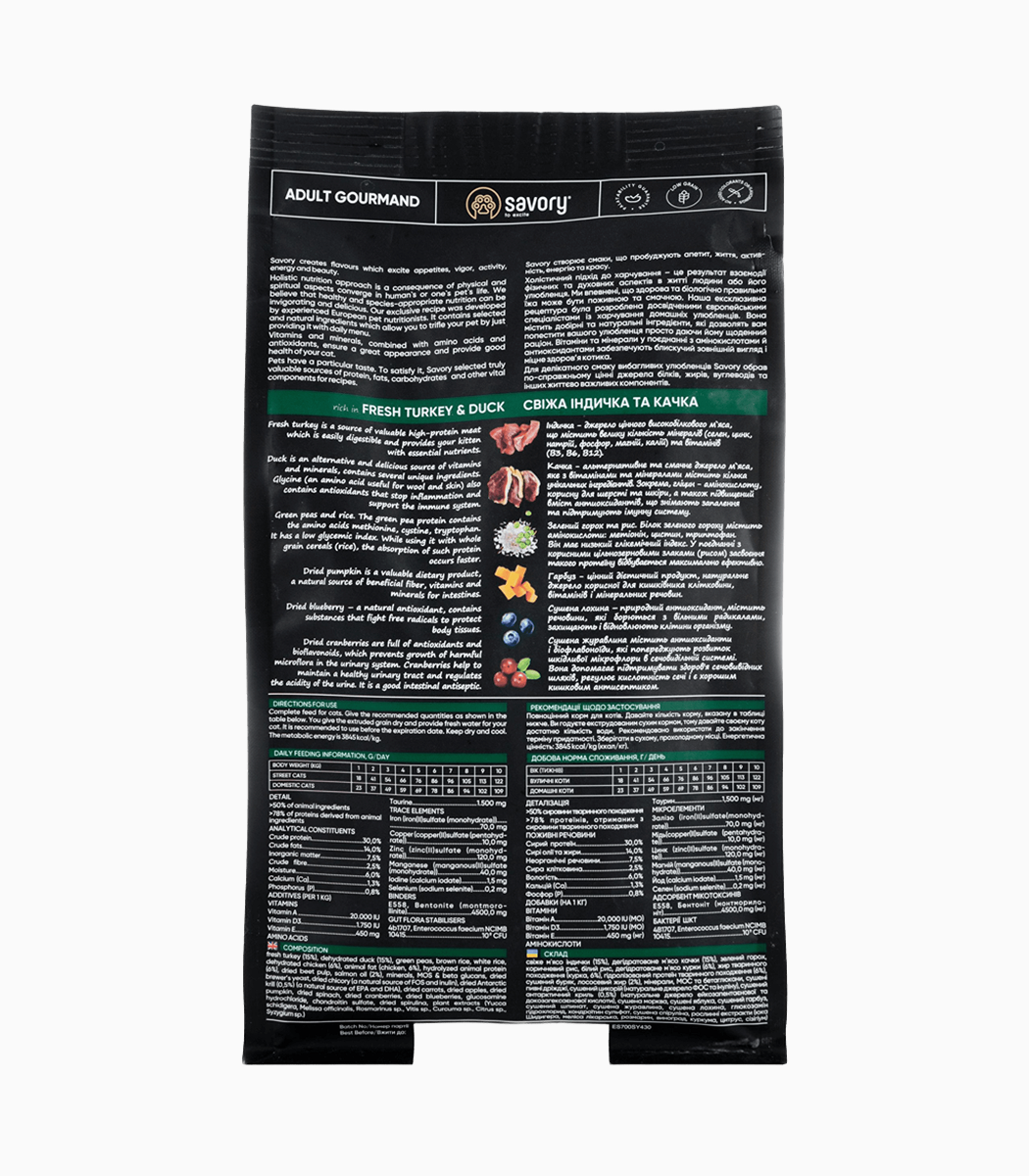 Свіжа індичка 15%, дегідрована качка 15%, зелений горох, коричневий рис, білий рис, дегідрована курка 6%, курячий жир 6%, гідролізований курячий протеїн 6%, сушена бурякова м’якіть, лососева олія 2%, мінерали, маннан-олігосахариди (МОС), сушені пивні дріжджі, сушений цикорій 0,5%, сушений антарктичний кріль 0,5%, сушена морква 0,5%, сушені яблука 0,5%, сушений гарбуз 0,5%, сушений шпинат 0,15%, сушена журавлина 0,15%, сушені чорниці 0,15%, глюкозамін, хондроїтину сульфат, сушена спіруліна 0,15%, трав’яна суміш (Юкка Мохаве, розмарин, куркума, цитрус, сизігіум/евгенія) 0,15%.