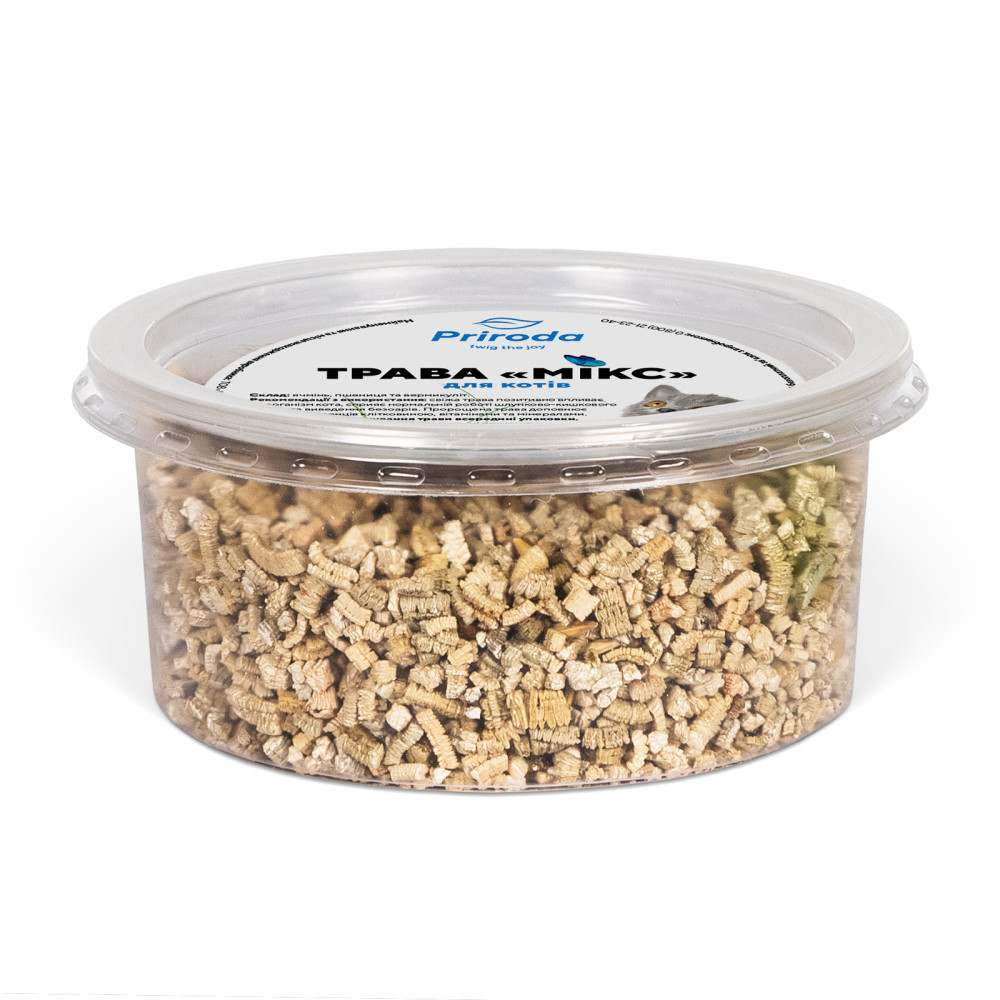Екологічно чиста зернова суміш для здоров’я вашого вихованця.Трава для котів ТМ «Природа» є джерелом вітамінів А, В, D, Е, а також мінеральних речовин таких як: кремній, фосфору, калію, кальцію, магнію, сірки, марганцю, селену, йоду, цинку, брому, міді, – а також рослинних волокон, які стимулюють роботу шлунка та кишківника.Суміш паростків викликає у домашнього улюбленця інтерес і пробуджує апетитЗерна перемішані з вермікулітом – мінеральною речовиною, що чудово утримує вологу і сприяє швидкому проростанню насіння.Сприяє покращенню травленняШвидко та легко суміш пророщується в домашніх умовахСклад: суміш зерен (ячмінь, пшениця), субстрат для пророщування.Спосіб пророщування:1. Лоток із зернами та вермикулітом рясно оббризкати водою, накрити харчовою плівкою або поліетиленовим пакетом та поставити у тепле світле місце на 3-4 дні. Щодня помірно поливати2. Зняти з лотка плівку, поставити у добре освітлене сонцем місце, щоденно помірно поливати відстояною водою3. Через 5-7 днів після проростання трава досить підросте і її можна пропонувати улюбленцям4. Нову траву можна починати пророщувати через 7-10 днів після того, як улюбленець з’їсть попередню порцію трави