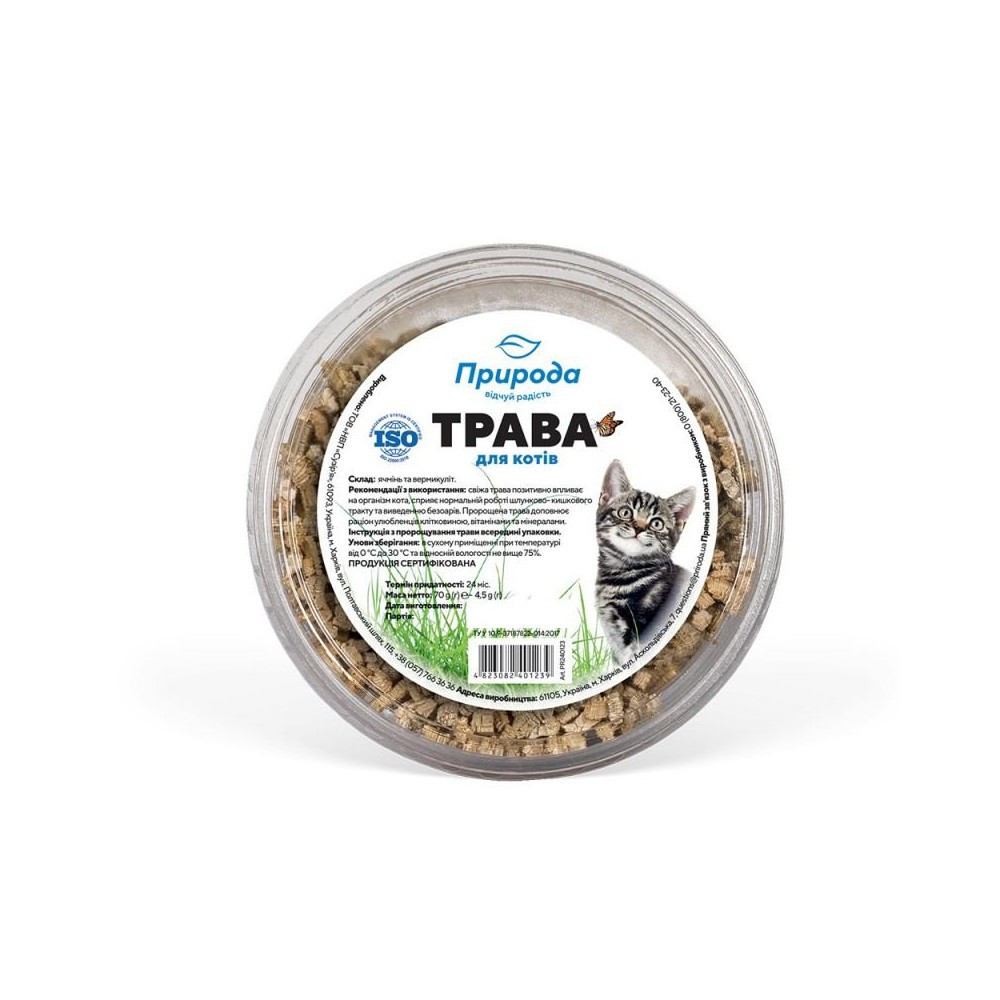 Екологічно чиста зернова суміш для здоров’я вашого вихованця.Трава для котів ТМ «Природа» є джерелом вітамінів А, В, D, Е, а також мінеральних речовин таких як: кремній, фосфору, калію, кальцію, магнію, сірки, марганцю, селену, йоду, цинку, брому, міді, – а також рослинних волокон, які стимулюють роботу шлунка та кишківника.Суміш паростків викликає у домашнього улюбленця інтерес і пробуджує апетитЗерна перемішані з вермікулітом – мінеральною речовиною, що чудово утримує вологу і сприяє швидкому проростанню насіння.Сприяє покращенню травленняШвидко та легко суміш пророщується в домашніх умовахСклад: ячмінь, вермікуліт.Спосіб пророщування:1. Лоток із зернами та вермикулітом рясно оббризкати водою, накрити харчовою плівкою або поліетиленовим пакетом та поставити у тепле світле місце на 3-4 дні. Щодня помірно поливати2. Зняти з лотка плівку, поставити у добре освітлене сонцем місце, щоденно помірно поливати відстояною водою3. Через 5-7 днів після проростання трава досить підросте і її можна пропонувати улюбленцям4. Нову траву можна починати пророщувати через 7-10 днів після того, як улюбленець з’їсть попередню порцію трави