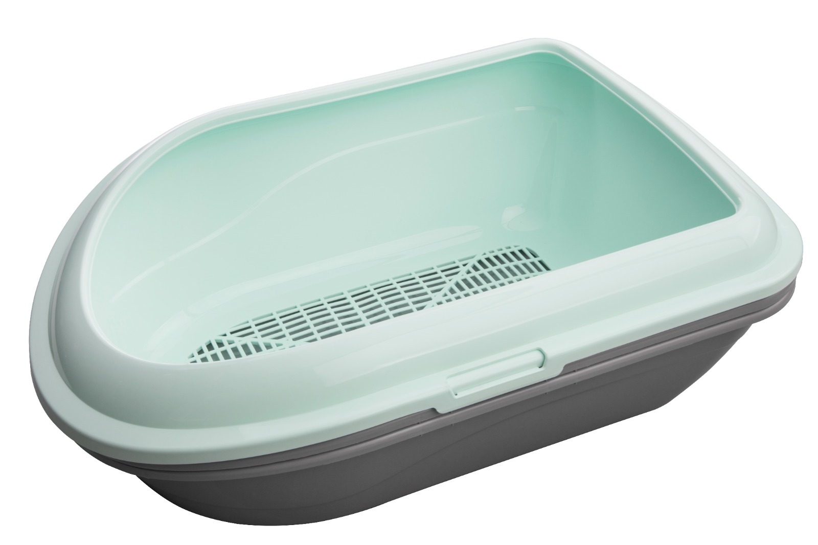 Туалет для дорослих котів та кішок з високими бортами, сіткою та подвійним піддоном. Високі борти перешкоджають розсипанню наповнювача. Виконаний із якісного пластику, не ковзає по поверхні. Легко миється та чиститься. Завдяки запасному піддону легко замінювати використаний наповнювач.Колір: м’ятний