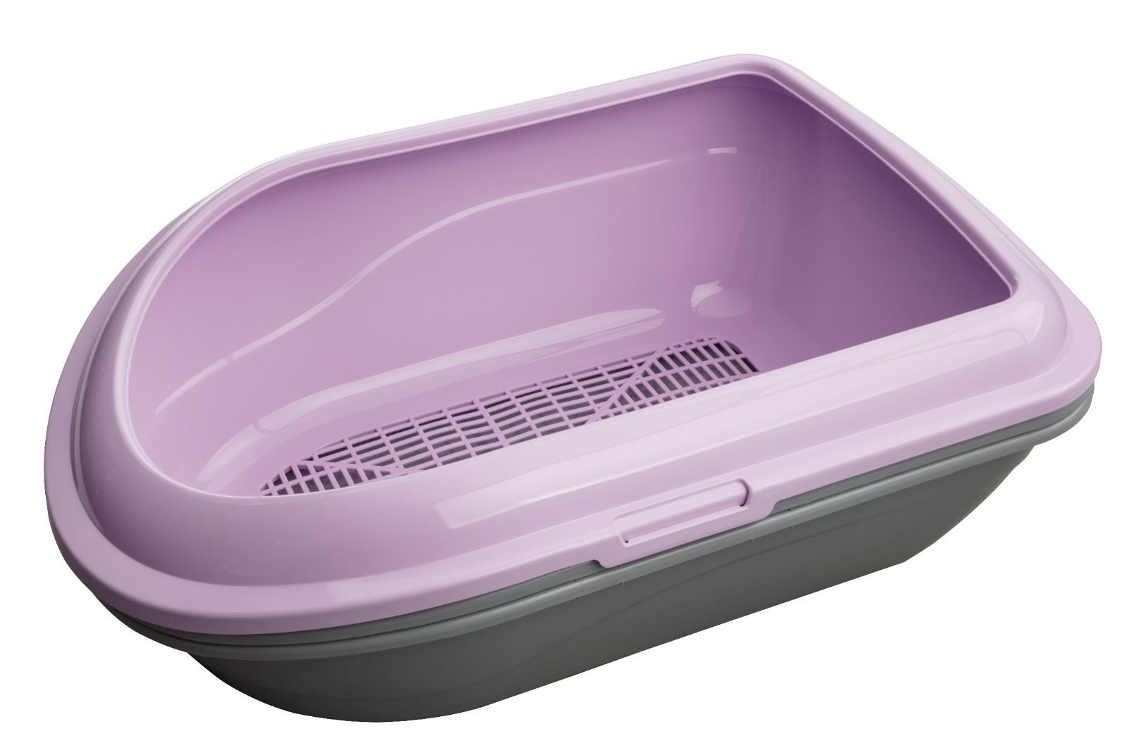 Туалет для дорослих котів та кішок з високими бортами, сіткою та подвійним піддоном. Високі борти перешкоджають розсипанню наповнювача. Виконаний із якісного пластику, не ковзає по поверхні. Легко миється та чиститься. Завдяки запасному піддону легко замінювати використаний наповнювач.Колір: фіолетовий