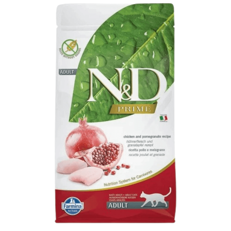 ND GRAIN FREE PRIME CAT CHICKEN POMEGRANATE ADULT 300 GRБеззерновий сухий корм для дорослих кішок (курка / гранат), 300 грFarmina N D Grain Free Feline Adult з куркою і гранатом – це повноцінний корм для дорослих кішок. Його ексклюзивна формула, що складається тільки з м’яса і без додавання злаків, замінена свіжими овочами та фруктами, дозволяє забезпечити тварині необхідними поживними речовинами, покращуючи його самопочуття і здоров’я.Завдяки таким інгредієнтам, як свіжа італійська курка і гранат, ці крокети приносять тварині необхідну енергію. Використання тільки свіжих і якісних продуктів дозволяє задовольнити енергетичні потреби кішки і зробити їжу ще смачнішою, ідеальною навіть для самого вишуканого смаку кішок. Лінія сухих кормів Grain Free Natural Delicious була розроблена для задоволення харчових потреб і смаків кішок, пропонуючи збалансовану кількість білків, вітамінів і мінералів, без додавання злаків.Склад: свіже куряче м’ясо без кісток (30%), дегідроване м’ясо курки (28%), картопля, курячий жир, зневоднені цільні яйця, свіжий оселедець, дегідрований оселедець, риб’ячий жир, гідролізат тваринних білків, волокна гороху, сушена морква, сушена люцерна, інулін , фруктоолігосахаріди, маннанолігосахаріди, порошок граната (0,5%), дегідровані яблука, порошок шпинату, подорожник (0,3%), порошок чорної смородини, дегідрований солодкий апельсин, порошок чорниці, хлорид натрію, дріжджі сухі пивні, корінь куркуми (0 , 2%), глюкозамін, хондроїтин сульфат, екстракт календули (джерело лютеїну).Харчові добавки на кг.: Вітамін А 18000МО; Вітамін D3 1200МО; Вітамін Е 600мг; вітамін С 300мг; Вітамін РР 150мг; Пантотенова кислота 50мг; Вітамін В2 20мг; Вітамін В6 8,1мг; Вітамін В1 10мг; Вітамін Н 1,5мг; Фолієва кислота 1,5 мг; Вітамін В12 0,1 мг; холіну хлорид 2500мг; бета-каротин 1,5мг; цинк 910мг; марганець 380мг; залізо 250мг; мідь 88мг; селенометіонін 0,40мг; DL-метіонін 5000мг; таурин 4000мг; L-карнітин 300мг. Спеціальні добавки: екстракт алое вера 1000 мг; екстракт зеленого чаю 100мг; екстракт розмарину. Антиоксиданти: токоферол з екстрактів натурального походження.Поживні речовини: сирий білок – 44%; сирі жири і масла – 20%; сира клітковина – 1,80%; сира зола – 8,50%; кальцій – 1,50%; фосфор – 1,30%; магній – 0,09%; Омега-6 – 3,30%; Омега-3 – 0,90%; DHA – 0,50%; EPA – 0,30%; глюкозамін – 1200мг / кг; хондроїтин сульфат – 900мг / кг.Енергетична цінність: 4204 ККАЛ/КГ – 17,59 МДЖ/КГРозмір гранули: L-8-10 мм, H-3,5-5 мм