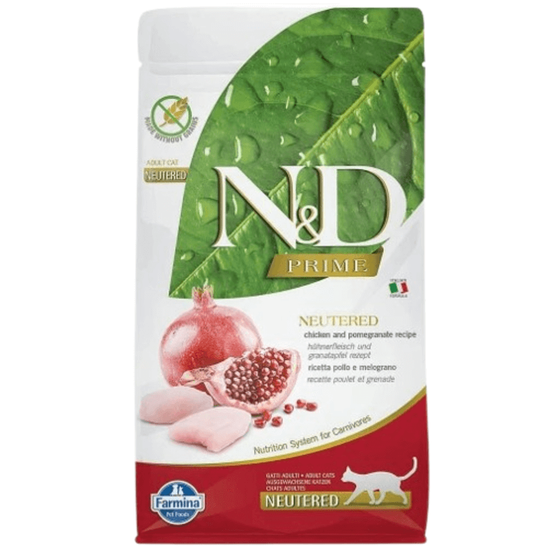 ND GRAIN FREE PRIME CAT CHICKEN POMEGRANATE NEUTERED ADULT 1.5kgБеззерновий сухий корм для дорослих стерилізованих кішок (курка / гранат), 1.5кгFarmina N D Grain Free Feline Neutered (Sterilized) – це повноцінний корм для дорослих стерилізованих кішок з куркою і гранатом. Його ексклюзивна формула, що складається тільки з м’яса і без додавання злаків, замінена свіжими овочами та фруктами, дозволяє забезпечити тварину необхідними поживними речовинами, покращуючи його самопочуття і здоров’я.Завдяки таким інгредієнтам, як свіжа італійська курка і яйця на 70%, овочі і мінерали на решту 30%, ці крокети відповідають принципам правильного хижого харчування. Використання тільки свіжих і якісних продуктів дозволяє задовольнити енергетичні потреби кішки і зробити їжу ще смачнішою, ідеальною навіть для самого вишуканого смаку кішок. Лінія сухих кормів Grain Free Natural Delicious була розроблена для задоволення харчових потреб і смаків кішок, пропонуючи збалансовану кількість білків, вітамінів і мінералів, без додавання злаків.Склад: свіже куряче філе (30%), дегідратоване куряче м’ясо (28%), картопля, курячий жир, зневоднені цільні яйця, свіжий оселедець, дегідратований оселедець, риб’ячий жир, гідролізат тваринного білка, волокна гороху, сушена морква, сушена люцерна, інулін, фруктоолігосахаріди , маннанолігосахаріди, порошок граната (0,5%), сушені яблука, порошок шпинату, подорожник (0,3%), порошок чорної смородини, дегідратований солодкий апельсин, порошок чорниці, хлорид натрію, сухі пивні дріжджі, корінь куркуми (0,2 %), глюкозамін, хондроитинсульфат, екстракт календули (джерело лютеїну).Харчові добавки на кг.: Вітамін А 18000МО; Вітамін D3 1200МО; Вітамін Е 600мг; Вітамін С 300мг; Ніацин 150мг; Пантотенова кислота 50мг; Вітамін В2 20мг; Вітамін В6 8,1мг; Вітамін В1 10мг; Вітамін H 1,5мг; Фолієва кислота 1,5 мг; Вітамін B12 0,1мг; хлорид холіну 2800мг; бета-каротин 1,5мг; хелат цинку 910мг; хелат марганцю 380мг; хелат заліза 250мг; хелат міді 88мг; селенометіонін 0,4мг; DL-метіонін 5000мг; таурин 5000мг; L-карнітин 400мг. Спеціальні добавки: екстракт алое вера 1000мг; екстракт зеленого чаю 100мг; екстракт розмарину. Антиоксиданти: токоферол з екстрактів натурального походження.Поживні речовини: сирий білок – 46%; сирі жири і масла – 11%; сира клітковина – 5,10%; сира зола – 8,90%; кальцій – 1,50%; фосфор – 1,30%; магній – 0,09%; Омега-6 – 2%; Омега-3 – 0,45%; DHA – 0,30%; EPA – 0,10%; глюкозамін – 1200мг / кг; хондроитин – 900мг / кг.Енергетична цінність: 3643 ККАЛ/КГ – 15,24 МДЖ/КГРозмір гранули: L-8-10 мм, H-3,5-5 мм.