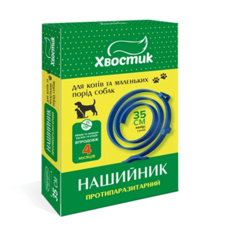 Хвостик ТМ. Протипаразитарний нашийник для котів та собак (діазінон), синього кольору, 35 смСклад1 г полімерної стрічки містить діючу речовину: діазинон – 60 мг.ЗастосуванняПрофілактика і лікування собак та котів, при ураженні ектопаразитами: блохами (Ctenocephalus felis, C. canis), паразитиформними кліщами (Dermacentor pictus, D. marginatus, Rhipicephalus bursa, R. sanguineus, Ixodes ricinus), при сифункулятозах та малофагозах котів та собак.ДозуванняНашийник застосовують шляхом нещільної фіксації на шиї тварин. Нашийник виймають із упакування та одягають на шию тварини, фіксуючи таким чином, щоб між шиєю та нашийником залишався невеликий проміжок у 1,0-1,5 см, закріплюють фіксатором та обрізають надлишок стрічки. Нашийник повинен бути вільним на шиї і не стримувати росту тварини. Підігнаний належним чином нашийник у закріпленому стані повинен вільно рухатися. Постійне використання нашийника забезпечує захист тварини від ектопаразитів протягом 4 місяців.Фармакологічні властивостіATCvet QP53, ектопаразитициди, інсектициди і репеленти (QP53AF03, діазинон)Діюча речовина нашийника – діазинон, діє на ектопаразитів як контактна отрута, викликаючи незворотне гальмування активності холінестерази, що призводить до розладу передачі нервових імпульсів, паралічу і загибелі паразитів. Активний щодо іксодових кліщів, вошей, бліх і волосоїдів.Нашийник належить до малотоксичних засобів, не виявляє місцево-подразнюючої і шкірно-резобтивної дії. Добре переноситься тваринами.ПротипоказанняНе застосовують цуценятам та кошенятам віком до 8-ми тижнів!Не застосовують хворим, виснаженим та старим тваринам!Не застосовують самкам під час вагітності і лактації!ЗастереженняПісля закріплення нашийника ретельно вимити руки теплою водою з милом. Людям із відомою гіперчутливістю до діазинону не контактувати з нашийником, людям із подряпинами та ушкодженнями на руках закріпляти нашийник у захисних рукавицях.Тварин із нашийником не допускати до малих дітей та немовлят.Форма випускуНашийники для собак довжиною 70 см та нашийники для собак малих порід та котів довжиною 35 см. Нашийники у пакетах з полімерної плівки, запаковані у картонні коробки по 1 штуці.ЗберіганняУ сухому захищеному від світла місці при температурі від 2 °С до 25 °С та відносній вологості не вище 75 %, окремо від кормів для тварин, води та продуктів. Зберігають у недоступному для дітей місці.Термін придатності:2 роки. Термін придатності нашийника після розкриття упакування – 4 місяці.Для застосування у ветеринарній медицині!Протипаразитарний нашийник для котів та собак (діазінон). РП №АВ-06262-03-16Виробник готового продукту: ТОВ «НОВА ПЛЮС», 61030, м. Харків, вул. Колісниченківська, буд. 7, УкраїнаДистриб’ютор: ТОВ фірма «ТРИПЛЕКС», 49101, м. Дніпро, вул. Троїцька, буд. 21а, Українаwww.zoo.triplex.com.ua E-mail:info.zoo@ie.net.ua