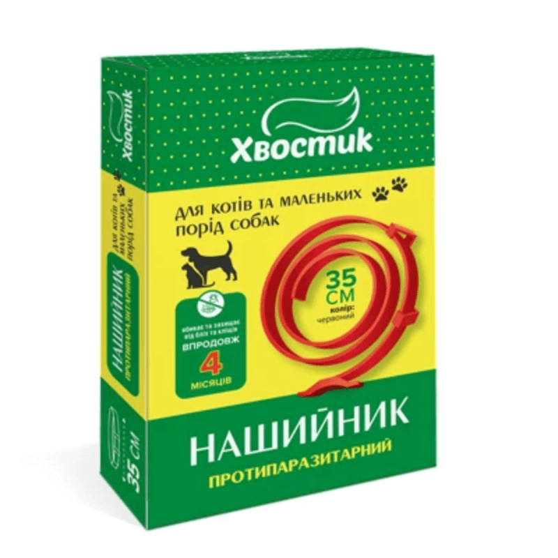 Хвостик ТМ. Протипаразитарний нашийник для котів та собак (діазінон), червоного кольору, 35 см.Склад1 г полімерної стрічки містить діючу речовину: діазинон – 60 мг.ЗастосуванняПрофілактика і лікування собак та котів, при ураженні ектопаразитами: блохами (Ctenocephalus felis, C. canis), паразитиформними кліщами (Dermacentor pictus, D. marginatus, Rhipicephalus bursa, R. sanguineus, Ixodes ricinus), при сифункулятозах та малофагозах котів та собак.ДозуванняНашийник застосовують шляхом нещільної фіксації на шиї тварин. Нашийник виймають із упакування та одягають на шию тварини, фіксуючи таким чином, щоб між шиєю та нашийником залишався невеликий проміжок у 1,0-1,5 см, закріплюють фіксатором та обрізають надлишок стрічки. Нашийник повинен бути вільним на шиї і не стримувати росту тварини. Підігнаний належним чином нашийник у закріпленому стані повинен вільно рухатися. Постійне використання нашийника забезпечує захист тварини від ектопаразитів протягом 4 місяців.Фармакологічні властивостіATCvet QP53, ектопаразитициди, інсектициди і репеленти (QP53AF03, діазинон)Діюча речовина нашийника – діазинон, діє на ектопаразитів як контактна отрута, викликаючи незворотне гальмування активності холінестерази, що призводить до розладу передачі нервових імпульсів, паралічу і загибелі паразитів. Активний щодо іксодових кліщів, вошей, бліх і волосоїдів.Нашийник належить до малотоксичних засобів, не виявляє місцево-подразнюючої і шкірно-резобтивної дії. Добре переноситься тваринами.ПротипоказанняНе застосовують цуценятам та кошенятам віком до 8-ми тижнів!Не застосовують хворим, виснаженим та старим тваринам!Не застосовують самкам під час вагітності і лактації!ЗастереженняПісля закріплення нашийника ретельно вимити руки теплою водою з милом. Людям із відомою гіперчутливістю до діазинону не контактувати з нашийником, людям із подряпинами та ушкодженнями на руках закріпляти нашийник у захисних рукавицях.Тварин із нашийником не допускати до малих дітей та немовлят.Форма випускуНашийники для собак довжиною 70 см та нашийники для собак малих порід та котів довжиною 35 см. Нашийники у пакетах з полімерної плівки, запаковані у картонні коробки по 1 штуці.ЗберіганняУ сухому захищеному від світла місці при температурі від 2 °С до 25 °С та відносній вологості не вище 75 %, окремо від кормів для тварин, води та продуктів. Зберігають у недоступному для дітей місці.Термін придатності:2 роки. Термін придатності нашийника після розкриття упакування – 4 місяці.Для застосування у ветеринарній медицині!Протипаразитарний нашийник для котів та собак (діазінон). РП №АВ-06262-03-16Виробник готового продукту: ТОВ «НОВА ПЛЮС», 61030, м. Харків, вул. Колісниченківська, буд. 7, УкраїнаДистриб’ютор: ТОВ фірма «ТРИПЛЕКС», 49101, м. Дніпро, вул. Троїцька, буд. 21а, Українаwww.zoo.triplex.com.ua E-mail:info.zoo@ie.net.ua