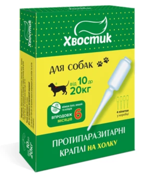 Хвостик ТМ. Протипаразитарні краплі на холку (фіпроніл), для собак вагою від 10 до 20 кгПакування 4 піпетки – крапельниціСклад: 100 мл препарату містять діючу речовину: фіпроніл – 10,0 г. Допоміжні речовини: пропіленгліколь.Застосування: Профілактика та лікування собак і котів при захворюваннях, спричинених ектопаразитами: блохами (Ctenocephalides spp., Pulex irritans), волосоїдами (Trichodectes canis, Felicola subrostratus), вошами (Linognathus setosus), паразитиформними кліщами (Ixodes ricinus, Dermacentor spp., Rhipicephalus spp.), тромбідиформними кліщами (Cheyletiella spp.), кліщами-шкіроїдами (Otodectes spp.) та шкірними ендопаразитами: свербуновими кліщами (Sarcoptes canis) на всіх стадіях розвитку.Дозування: Препарат наносять зовнішньо безпосередньо на шкіру за допомогою піпетки-крапельниці у місця, недоступні для злизування собакам та котам, у ділянці холки та вздовж хребта, у дозах:Цуценята, кошенята, собаки малих порід вагою від 0,5 до 2 кг – 1 піпетка-крапельниця (0,5 мл).Коти та собаки вагою від 2 до 10 кг – 1 піпетка-крапельниця (0,8 мл).Коти та собаки вагою від 10 до 20 кг – 1 піпетка-крапельниця (1,5 мл).Коти та собаки вагою від 20 до 40 кг – 1 піпетка-крапельниця (3,0 мл).Коти та собаки вагою від 40 кг – 1 піпетка-крапельниця (6,0 мл).Препарат наноситься одноразово однією піпеткою-крапельницею. При нанесенні захист тварин від ектопаразитів триває протягом 1,5-2 місяців. Далі наноситься друга пипетка-крапельніца. Через 1,5-2 місяця третя і так далі. Таким чином безпреривне використання 4-х піпеток-крапельниць забеспечує захист тварини впродовж 6 – 8 місяців.З профілактичною метою тварин обробляють кожні 1,5-2 місяці.При саркоптоїдозах, волосоїдах і вошах обробку проводять 2-3 рази з інтервалом 8-10 діб.Протипоказання: Не застосовувати хворим, виснаженим та ослабленим тваринам. Не застосовувати тваринам віком до 10 тижнів. Не застосовувати тваринам чутливим до фіпронілу. Не застосовувати самкам під час лактації і вагітності.Застереження: Під час роботи з препаратом забороняється палити, пити та приймати їжу. Після закінчення обробки слід ретельно вимити руки теплою водою з милом. При випадковому попаданні препарату на шкіру чи слизові оболонки його необхідно промити теплою проточною водою. Не рекомендують купати тварин за три доби до та за три доби після обробки. Після закінчення цього терміну купання без зоошампуню не знижує захисного ефекту препарату. Не допускати злизування препарату твариною після обробки. Уникати попадання препарату в очі.Зберігання: Зберігати препарат у сухому темному місці, окремо від продуктів харчування та кормів, у недоступному для дітей і тварин місці, за температури від 0 до 25 ºС.Термін придатності: 3 роки.Для застосування у ветеринарній медицині!РП №АВ-07769-03-18 Краплі інсекто акарицидні для собак та котів (Фіпроніл)Виробник готового продукту: ТОВ «НОВА ПЛЮС», 61030, м. Харків, вул. Колісниченківська, буд. 7, УкраїнаДистриб’ютор: ТОВ фірма «ТРИПЛЕКС», 49101, м. Дніпро, вул. Троїцька, буд. 21а, Українаwww.zoo.triplex.com.ua E-mail:info.zoo@ie.net.ua