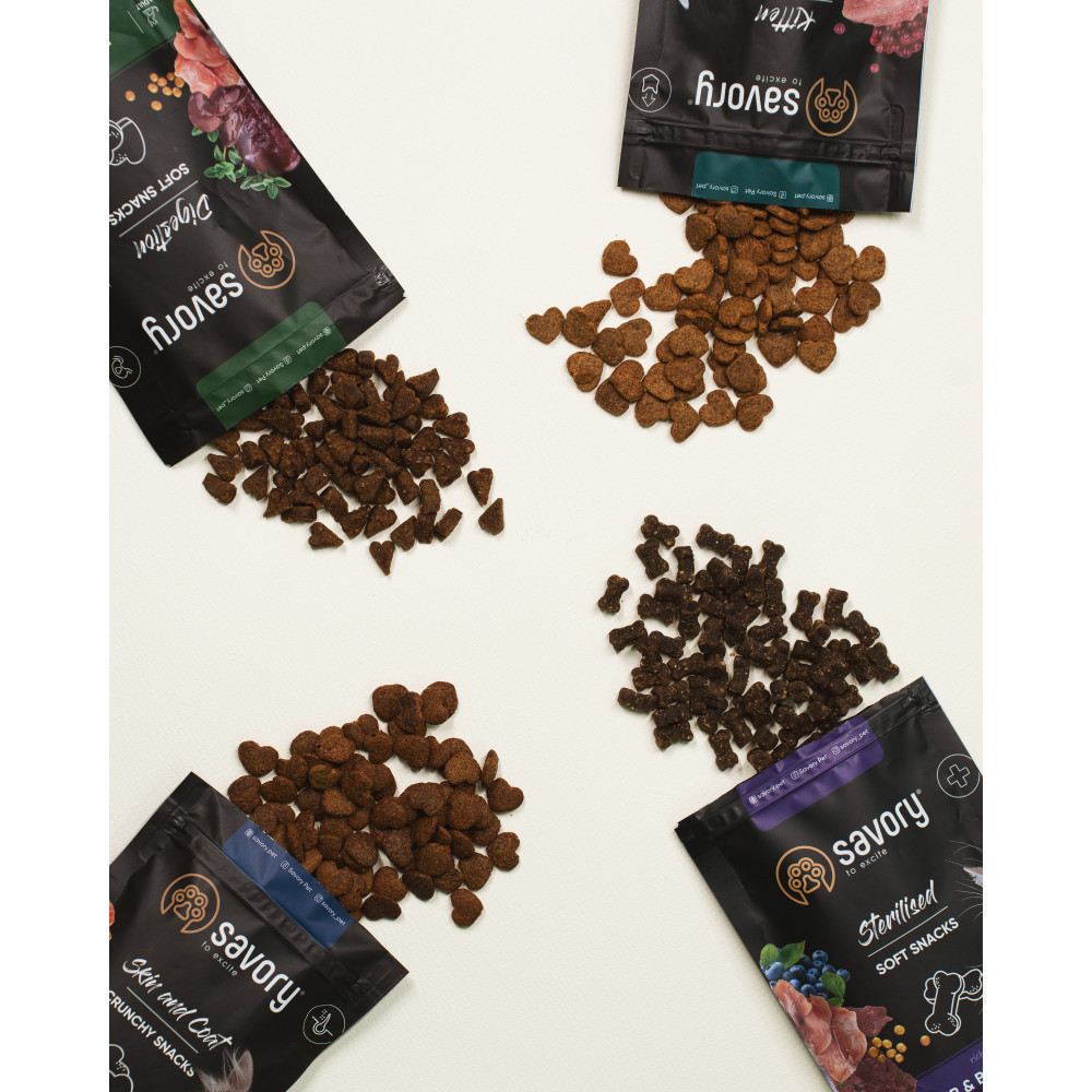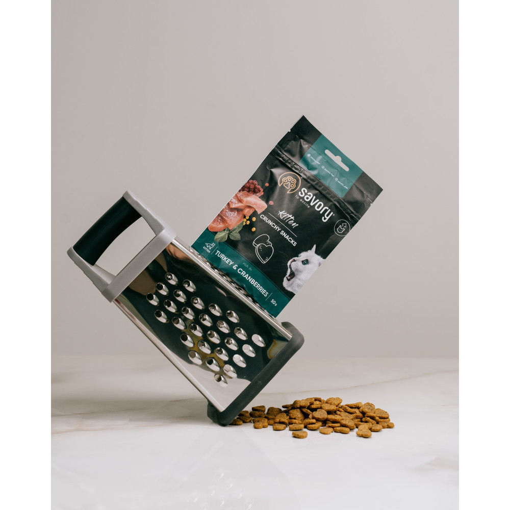 Хрусткі ласощі Savory для кошенят.Додаткове харчування, що можна використовувати як заохочення та винагороду для улюбленця. Не тільки висока смакова привабливість, але й корисні складові, що є основою здорового харчування, роблять ласощі Savory ідеальним доповненням до раціону і частуванням для малечі.Індичка — дієтичне мʼясо, що є необхідним для здорового розвитку кошеняти.Перепілка — новий смак та аромат мʼяса неодмінно сподобається найвибагливішим ласунчикам.Журавлина — ніжно піклується про кислотність сечі та запобігає багатьом захворюванням сечовивідної системи.Котяча мʼята — зміцнює нервову систему, допомагає легше переносити стреси.Вік: кошенята до 1 року, або до моменту стерилізації, якщо процедура проводиться раніше фізіологічної зрілості.Переваги:крихка текстура дозволяє використовувати ласощі з раннього віку, ще до зміни зубів, без остраху зіпсувати прикус кошеняти;чудове доповнення до раціону улюбленців, які харчуються м’яким кормом. Снеки мають шорстку поверхню, їх розгризання механічно очищує зуби та зміцнює ясна;беззерновий склад ласощів ідеально підійде улюбленцям, що мають алергію на глютен, клейковину, зернові культури тощо;снеки не містять штучних барвників, підсилювачів смаку та аромату;екстракти лікарських рослин мають накопичувальний ефект, тому, для отримання цілковитої користі від ласощів, слід використовувати їх на постійній основі для заохочування і частування улюбленців.Склад: протеїн індички 35%, жовтий горох 21%, картопля 15%, протеїн перепілки 10%, жир домашньої птиці 9%, гідролізована куряча печінка 4%, горохове борошно 2.7%, ріпакова олія 2%, сушена журавлина 1%, сушена котяча м’ята 0.3%.Поживні речовини:сирий білок 33.0%, сирий жир 13.0%, сира зола 8.5%, сира клітковина 1.0%, вологість 10.0%.Вітаміни та мікроелементи:кальцій2.0%, фосфор 1.2%, натрій 0.2%, магній 0.1%, омега-3 жирні кислоти 0.20%, омега-6 жирні кислоти 1.90%.Енергетична цінність:3710 ккал/кгРекомендації з годування.Ця добавка – не заміна основного раціону. Такі ласощі давати щодня у вигляді заохочення чи винагороди, але не перевищувати 10% від щоденної порції основного раціону улюбленця. Слідкуйте за тим, щоб у вашого вихованця завжди була свіжа питна вода.Вага кошеняти (кг)1-23-44-6Штук на день5810