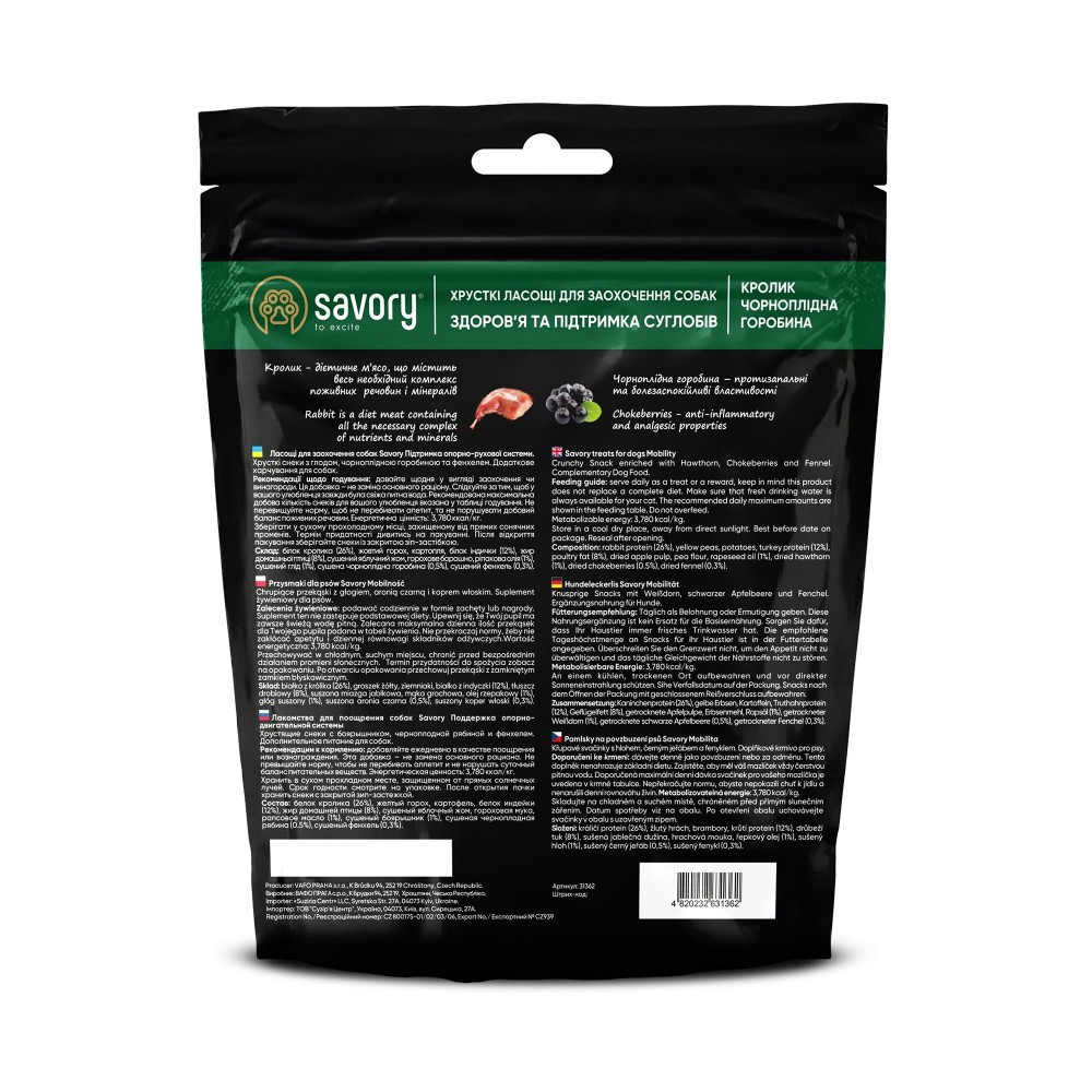 Хрусткі ласощі Savory для дорослих собак усіх порід. Додаткове харчування, яке можна використовувати у якості заохочення та, як винагороду для улюбленця. Не тільки висока смакова привабливість, але й корисні складові, що є основою здорового харчування, роблять ласощі Savory ідеальним доповненням до основного раціону і частуванням для вашого улюбленця.Кролик– багатий на мінерали та вітаміни групи В, тож допомагає зміцненню кісткових структур, суглобів та нервової системи.Фенхель– багатий кальцієм компонент, що зміцнює кістки.Поєднання глоду та чорноплідної горобини– комбінація природніх антиоксидантів, що підсилюють дію один одного.Особливості:Хрустка текстура дозволяє використовувати ласощі для улюбленців з чутливими зубами та яснами, котрим важко розгризати м’які та щільні смаколики.Чудове доповнення до раціону улюбленців, які харчуються м’яким кормом. Снеки мають шорстку поверхню, а їх розгризання стимулює механічне. очищення зубів та зміцнення ясен.Беззерновий склад ласощів ідеально підійде улюбленцям, що мають алергії на глютен, клейковину, злакові зернові культури, тощо.Не містять штучних барвників, підсилювачів смаку та аромату.Екстракти лікарських і корисних рослин мають накопичувальний ефект, тому краще за все, для отримання повного спектру користі від ласощів, використовувати їх на постійній основі для заохочування і частування улюбленців.Склад:Протеїн кролика 26%, жовтий горох, картопля, протеїн індички 12%, пташиний жир 8%, сушена яблучна м’якоть, горохове борошно, ріпакова олія 1%, сушений глід 1%, сушена чорноплідна горобина 0.5%, сушений фенхель 0.3%Аналітичний склад:Сирий протеїн 29.0%, сирий жир 14.0%, сира зола 7.5%, сира клітковина 1.6%, вологість 10.0%, кальцій 1.7%, фосфор 1.0%, натрій 0.1%, омега-3 жирні кислоти 0.25%, омега-6 жирні кислоти 1.80%Енергетична цінність:3,780 ккал/кгВага улюбленцяНорма снеків (штук на день)до 5 кг510 кг1215 кг1520 кг2025 кг2230 кг2540 кг2850 та більше кг30*дотримуйтесь норм годування, аби не перебивати апетит, та не перегодовувати улюбленця
