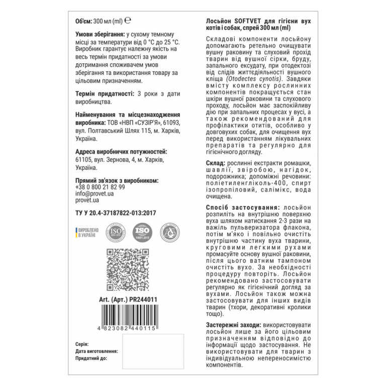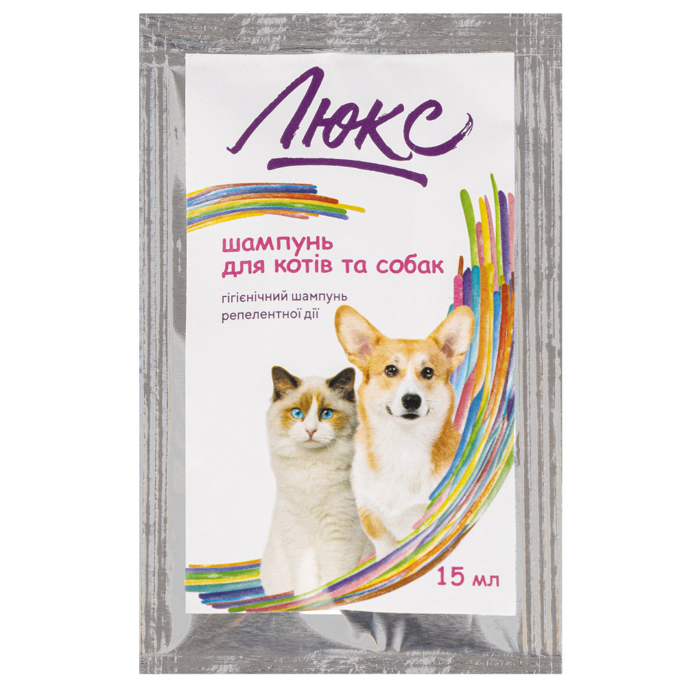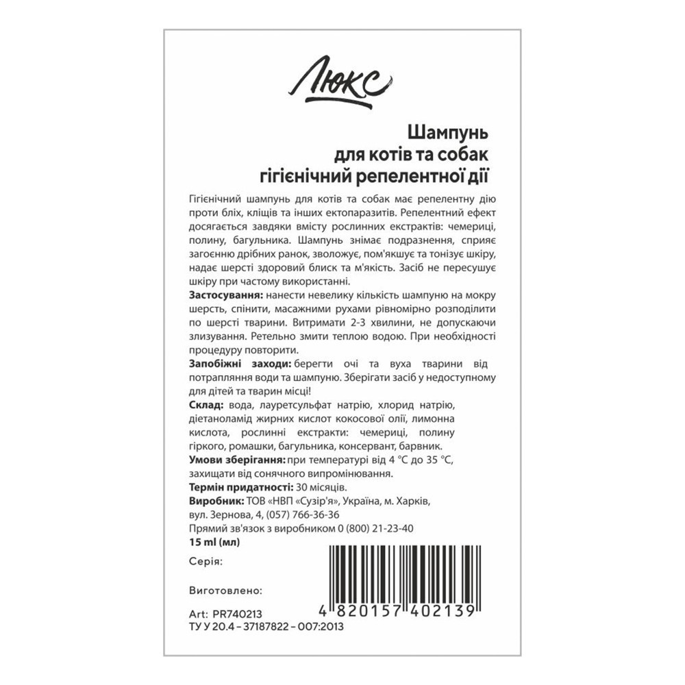 Гігієнічний шампунь для котів та собак має репелентну дію проти бліх, кліщів та інших ектопаразитів. Репелентний ефект досягається завдяки вмісту рослинних екстрактів: чемериці, полину, багульника.Шампунь знімає подразнення, сприяє загоєнню дрібних ранок, зволожує, пом’якшує та тонізує шкіру, надає шерсті здоровий блиск та м’якість. Засіб не пересушує шкіру при частому використанні.Спосіб застосування:Нанести невелику кількість шампуню на мокру шерсть, спінити, масажними рухами рівномірно розподілити по шерсті тварини. Витримати 2-3 хвилини, не допускаючи злизування. Ретельно змити теплою водою. При необхідності процедуру повторити. Берегти очі та вуха тварини від потрапляння води та шампуню.Умови зберігання:При температурі від 4 °С до 35 °С. Не допускати контакту з харчовими продуктами, напоями, кормом для тварин. Захищати від прямих сонячних променів. Зберігати засіб у недоступному для дітей місці.Склад:Вода, лауретсульфат натрію, хлорид натрію, діетаноламід жирних кислот кокосової олії, лимонна кислота, рослинні екстракти: чемериці, полину гіркого, ромашки, багульника, консервант, барвник.Термін придатності:30 місяців.Об’єм:15 мл.Технічні умови (ТУ):ТУ У 20.4-37187822-007:2013. Сертифікат ISO 9001:2015.