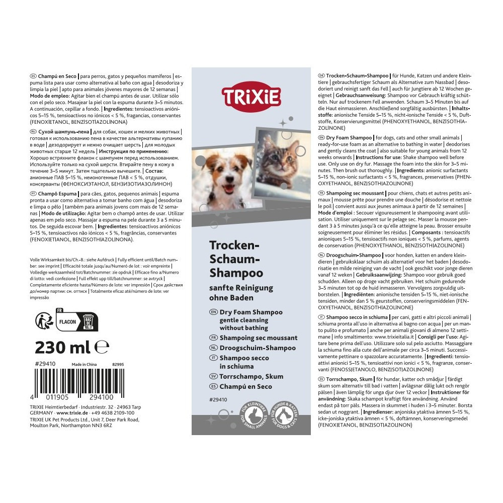 Сухий шампунь-пінка Trixie – ідеальне рішення для швидкого та ефективного догляду за шерстю вашого улюбленця без використання води!Цей готовий до застосування засіб у вигляді піни є чудовою альтернативою традиційному купанню, особливо коли потрібно освіжити тварину між повноцінними водними процедурами, або якщо ваш вихованець не любить воду.Основні переваги:Підходить для собак, котів та інших дрібних тварин.Очищення та дезодорація: пінка м’яко очищає шерсть, видаляючи забруднення та усуваючи неприємні запахи.Безпечно для молодих тварин: можна використовувати для цуценят і кошенят з 12 тижнів.Готовий до використання: формат піни дозволяє швидко та легко нанести засіб.Інструкція із застосування:Добре струсіть шампунь перед використанням.Використовуйте тільки на сухій шерсті.Масажними рухами втирайте піну в шкіру протягом 3–5 хвилин.Після нанесення ретельно вичешіть шерсть.Інгредієнти:аніонні ПАР 5–15 %, неіонні ПАР <5 %, ароматизатори, консерванти (PHENOXYETHANOL, BENZISOTHIAZOLINONE).