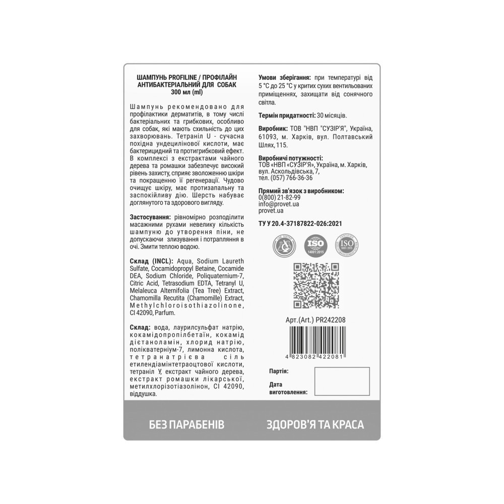 Шампунь рекомендовано для профілактики дерматитів, в тому числі бактеріальних та грибкових, особливо для собак, які мають схильність до цих захворювань.Тетраніл U – компонент, який має бактерицидний та протигрибковий ефект. В комплексі з екстрактами чайного дерева та ромашки забезпечує високий рівень захисту, сприяє зволоженню шкіри та покращенню її регенерації. Чудово очищує шкіру, має протизапальну та заспокійливу дію. Шерсть набуває доглянутого та здорового вигляду.Шампунь може застосовуватися як профілактичний засіб, підходить для собак усіх порід. Аромат- чайне дерево. Зручний дозатор дозволяє дозувати кількість шампуню, що полегшує використання шампуню як вдома, так і в грумінг салоні.Переваги:містить Tetranyl U,екстракт чайного дерева та екстракт ромашкибактерицидний та протигрибковий ефектусуває свербіння і подразнення шкірипрофілактика дерматитівне пересушує шкіруне містить парабенів та силіконівСпосіб застосування:рівномірно розподілити масажними рухами невелику кількість шампуню до утворення піни, не допускаючи злизування і потрапляння в очі. Змити теплою водою.Умови зберігання:При температурі від 5 °С до 25 °С у критих, сухих, вентильованих приміщеннях, захищати від сонячного світла.Склад:Aqua, Sodium Laureth Sulfate, Cocamidopropyl Betaine, Cocamide DEA, Sodium Chloride, Poliquaternium-7, Citric Acid, Tetrasodium EDTA, Tetranyl U, Melaleuca Alternifolia (Tea Tree) Extract, Chamomilla Recutita (Chamomille) Extract, Methylchloroisothiazolinone, CI 42090, Parfum.Термін придатності:30 місяців.Об`єм:300 мл.Технічні умови (ТУ):ТУ У 20.4-37187822-026:2021. Сертифікат ISO 9001:2015.