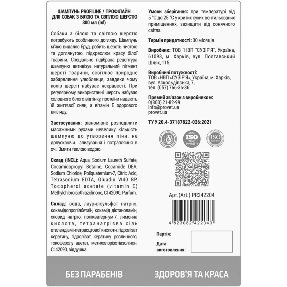 Собаки з білою та світлою шерстю потребують особливого догляду. Шампунь м’яко видаляє бруд, робить шерсть чистою та доглянутою, підкреслює красу білої тварини.Спеціально підібрана рецептура шампуню активізує натуральний пігмент шерсті тварини, освітлює природне забарвлення улюбленця. При регулярному використанні шерсть набуває яскравості та холодного білого відтінку, протеїни надають їй життєвої сили, а вітамін Е здорового вигляду. Аромат-квіти бавовни.Зручний дозатор дозволяє дозувати кількість шампуню, що полегшує використання шампуню як вдома, так і в грумінг салоні.Переваги:містить протеїни зародків пшениці, вітамін Е та пігмент для білої шерстіспеціальна підібрана рецептура з урахуванням фізіологічних особливостей тваринишерсть набуває холодного білого відтінкулегке розчісування та антистатичний ефектне містить парабенів та силіконівСпосіб застосування:рівномірно розподілити масажними рухами невелику кількість шампуню до утворення піни, не допускаючи злизування і потрапляння в очі. Змити теплою водою.Умови зберігання:При температурі від 5 °С до 25 °С у критих, сухих, вентильованих приміщеннях, захищати від сонячного світла.Склад:Aqua, Sodium Laureth Sulfate, Cocamidopropyl Betaine, Cocamide DEA, Sodium Chloride, Poliquaternium-7, Citric Acid, Tetrasodium EDTA, Gluadin W40 BP, Tocopherol acetate (vitamin E) Methylchloroisothiazolinone, CI 42090, Parfum.Термін придатності:30 місяців.Об`єм:300 мл.Технічні умови (ТУ):ТУ У 20.4-37187822-026:2021. Сертифікат ISO 9001:2015.