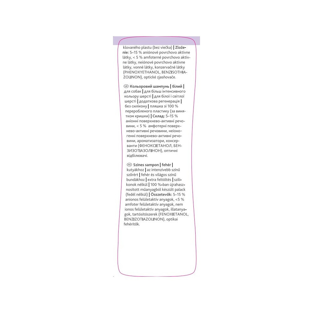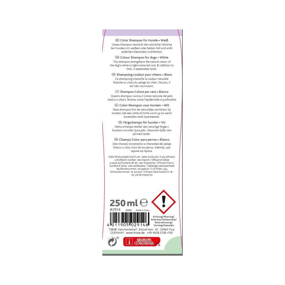 Шампунь Trixie Color-Shampoo White розроблений для посилення природного кольору шерсті і підходить для собак із білою або світлою шерстю.Цей шампунь не лише ефективно очищає, але й забезпечує додаткове поповнення поживних речовин, роблячи шерсть здоровою та доглянутою.Інтенсивний колір: для більш насиченого кольору шерстіСпеціально для світлих: ідеально підходить для білої та світлої шерсті.Глибоке живлення: забезпечує додаткове поповнення поживних елементівЧистий склад: без силіконів для природного здоров’я шерсті.Екологічна пляшка: виготовлений зі 100% переробленого пластику (кришка не включена), що підкреслює турботу Trixie про довкілля.Об’єм:250 млСклад:5–15 % аніонні ПАР, < 5 % амфотерні ПАР, неіоногенні ПАР, ароматизатори, консерванти (феноксіетанол, бензізотіазолінон), оптичні відбілювачі.