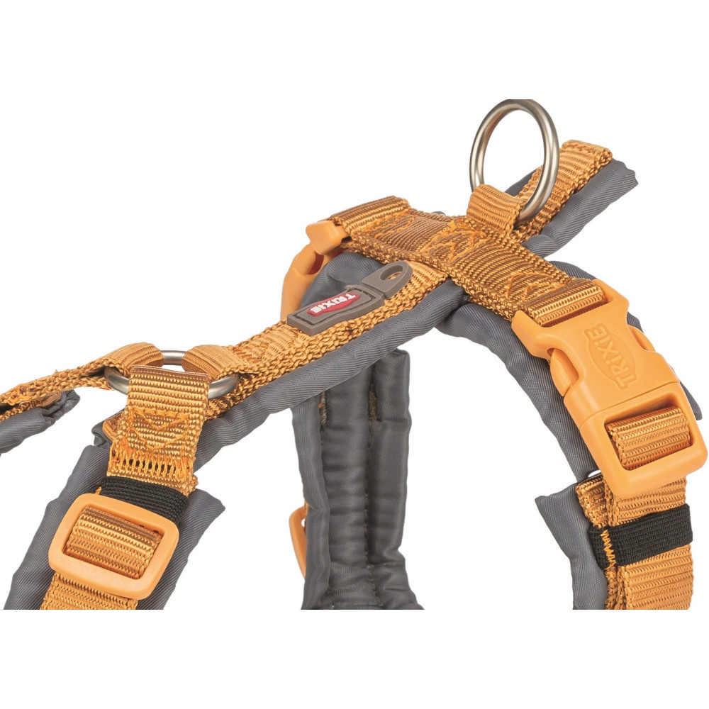 Шлея Trixie Premium трекінгова ідеально підходить для щоденних прогулянок з улюбленцем, гарантуючи вам надійний контроль, а песику – безпеку. Вона виготовлена з міцної ремінної стрічки, має м’яку оббивку по всьому колу. Ремінці на шиї та животі регулюються, що дає можливість підігнати шлею під індивідуальні розміри собаки. Є додаткове кільце для кріплення повідця в області грудей і петля для кріплення жетона або мигалки.Відповідає вимогам щодо добробуту тварин відповідно до розділу 18 (AT).Матеріали: ремінна стрічкаРозмір: XL, 80–97 см/25 ммКолір: оранжево-сіра
