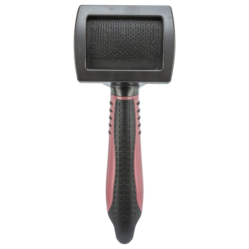 Ця щітка Trixie має м’яку щетину з дроту та пластикову прогумовану ручку.Підходить для котів з довгою шовковистою шерстю та для короткошерстих порід.Розміри: 7 × 16 см