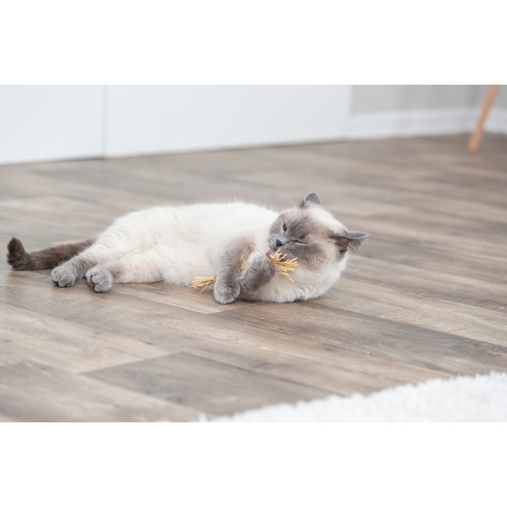Ця іграшка для котів Trixie – оригінальний спосіб розважити вашого пухнастика. Мататабі притягуватиме увагу котика, китиці з рафії пробуджуватимуть у ньому мисливський інстинкт, а джутова нитка стане ідеальною «зубною щіткою» для підтримання гігієни зубів.Поєднуючи в собі кілька елементів, іграшка стає ще цікавішою та захопливішою для вусатого мисливця.Матеріали: мататабі, джутова нитка, рафія.Розміри: 24 см
