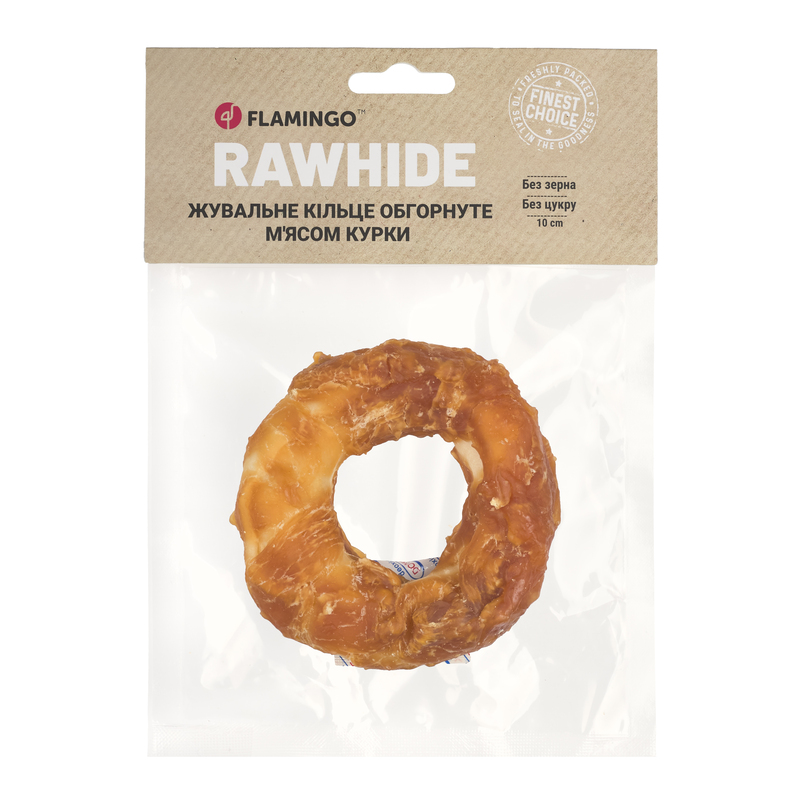 Ласощі Flamingo жувальне кільце обгорнуте м’ясом курки для собак10 см | 1 шт | 100 гУявіть ідеальний перекус для Вашої собаки – жувальне кільце обгорнуте ніжнимм’ясом куркивід якого будь-який улюбленець просто не зможе відірватися!Ласощі Flamingo – це 100% натуральні інгредієнти, максимум користі та задоволення у кожному шматочку, а все тому, що ми знаємо секрет ідеального перекусу!Ласощі виготовляються методом делікатного сушіння за контрольованих температур, що дозволяє зберегти максимум поживних речовин, смаку та аромату.Завдяки цій технології закуски є натуральними, без додавання консервантів, з тривалим терміном зберігання.Жувальні ласощі Flamingo – це смачний додаток до раціону улюбленця, який допомагає зняти стрес та природним чином доглянути за ротовою порожниною,запобігти утвореннюзубного каменю.Ідеальний вибір для щоденного частування з турботою про здоров’я!Чому варто обрати ласощі ТМ Flamingo?Високоякісний білокОсновою ласощів є натуральне м’ясо курки (45%), яке містить велику кількість білка та має низький вміст жиру, що робить їх ідеальним вибором для підтримки здоров’я та активності улюбленця.Вітамінний комплексМ’ясо курки містить цінні вітаміни та мінерали: B6, B12, залізо та цинк – важливі компоненти для здорового харчування улюбленця.Догляд за ротовою порожниноюВміст сиром’ятної шкіри (47%) ефективно допомагає очистити зубний наліт та підтримують гігієну ротової порожнини.Сповільнює процес поїданняЖувальні ласощі сповільнюють поїдання та занадто швидке проковтування, що покращує травлення та знижує ризик завороту кишок на 30-40%.Легке засвоєнняЗавдяки м’якій текстурі та складу ласощі легко перетравлюються, що робить їх ідеальним вибором для тварин з чутливим травленням.Безпечний складПродукт не містить глютену, цукру та штучних добавок, що мінімізує ризик виникнення алергічних реакцій.Надійне зберіганняВакуумна упаковка з поглиначем запаху та зручною zip-застібкою забезпечує довготривалу свіжість продукту.Склад: Сиром’ятна шкіра 47%, курка 45%, картопляний крохмаль 4%, рослинний білок 2%, гліцерин 1,8%, сіль 0,2%.Добавки:Добавки технологічні:Сорбат калію 0,1%.Аналітичний склад: Сирі жири: 4%. Сирий протеїн: 55%. Сира зола: 4%. Сира клітковина: 3%. Вологість: 18%.Спосіб застосування:рекомендовано для тварин віком від 4 місяців.Рекомендації з годуваннямаксимальна добова норма (гр на день) 10 кг 10 – 25 кг 25 кг 20 30 40Застереження:не використовувати у разі індивідуальної непереносиності інгредієнтів. Продукт не є повноцінним харчуванням і має даватися виключно як доповнення до основного раціону.Умови зберігання:зберігати засіб у темному сухому приміщенні, окремо від харчових продуктів при температурі від 5 °С до 25 °С.Фасування:1 кільце × 100 г, довжина 10 см.Термін придатності:3 рокиТоргівельна марка:FlamingoКраїна виробник:Бельгія