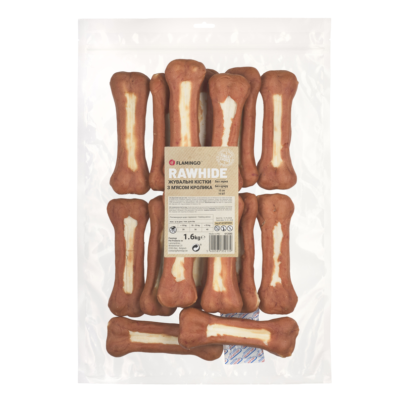 Ласощі Flamingo жувальні кістки обгорнуті м’ясом кролика для собак15 см | 100 г | 16 шт | 1.6 кгУявіть ідеальний перекус для Вашої собаки – жувальні кістки обгорнуті ніжним м’ясом кролика від яких будь-який улюбленець просто не зможе відірватися!Ласощі Flamingo – це 100% натуральні інгредієнти, максимум користі та задоволення у кожному шматочку, а все тому, що ми знаємо секрет ідеального перекусу!Ласощі виготовляються методом делікатного сушіння за контрольованих температур, що дозволяє зберегти максимум поживних речовин, смаку та аромату.Завдяки цій технології закуски є натуральними, без додавання консервантів, з тривалим терміном зберігання.Жувальні ласощі Flamingo – це смачний додаток до раціону улюбленця, який допомагає зняти стрес та природним чином доглянути за ротовою порожниною,запобігти утвореннюзубного каменю.Ідеальний вибір для щоденного частування з турботою про здоров’я!Чому варто обрати ласощі ТМ Flamingo?Високоякісний білокОсновою ласощів є натуральне м’ясо кролика (36%), яке містить велику кількість білка та має низький вміст жиру, що робить їх ідеальним вибором для підтримки здоров’я та активності улюбленця.Вітамінний комплексМ’ясо кролика – це природне джерело заліза, цинку та фосфору, яке підтримує здоров’я та посилює імунну систему тварин.Догляд за ротовою порожниноюВміст сиром’ятної шкіри (60%) ефективно допомагає очистити зубний наліт та підтримують гігієну ротової порожнини.Сповільнює процес поїданняЖувальні ласощі сповільнюють поїдання та занадто швидке проковтування, що покращує травлення та знижує ризик завороту кишок на 30-40%.Легке засвоєнняЗавдяки м’якій текстурі та складу ласощі легко перетравлюються, що робить їх ідеальним вибором для тварин з чутливим травленням.Безпечний складПродукт не містить глютену, цукру та штучних добавок, що мінімізує ризик виникнення алергічних реакцій.Надійне зберіганняВакуумна упаковка з поглиначем запаху та зручною zip-застібкою забезпечує довготривалу свіжість продукту.Склад:Сиром’ятна шкіра 60%, кролик 36%, рослинний білок 1,5%, гліцерин 1,25%, крохмаль батату 1%, сіль 0,25%.Добавки:Добавки технологічні:Сорбат калію 0,1%.Аналітичний склад:Сирі жири: 2,5%. Сирий протеїн: 60%. Сира зола: 3,5%. Сира клітковина: 2%. Вологість: 16%.Спосіб застосування:рекомендовано для тварин віком від 4 місяців.Рекомендації з годуваннямаксимальна добова норма (гр на день) 10 кг 10 – 25 кг 25 кг 20 30 40Застереження:не використовувати у разі індивідуальної непереносиності інгредієнтів. Продукт не є повноцінним харчуванням і має даватися виключно як доповнення до основного раціону.Умови зберігання:зберігати засіб у темному сухому приміщенні, окремо від харчових продуктів при температурі від 5 °С до 25 °С.Фасування:16 кістки × 100 г (загальна вага 1.6 кг), довжина 15 см.Термін придатності:3 рокиТоргівельна марка:FlamingoКраїна виробник:Бельгія